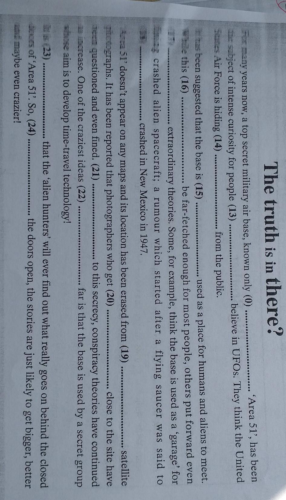 For many years now, a top secret military air base, known only (0) as 'Area 51', has been subject of intense curiosity for people (13) who believe in UFOs. They think the United States Air Force is hiding (14) something from the public.