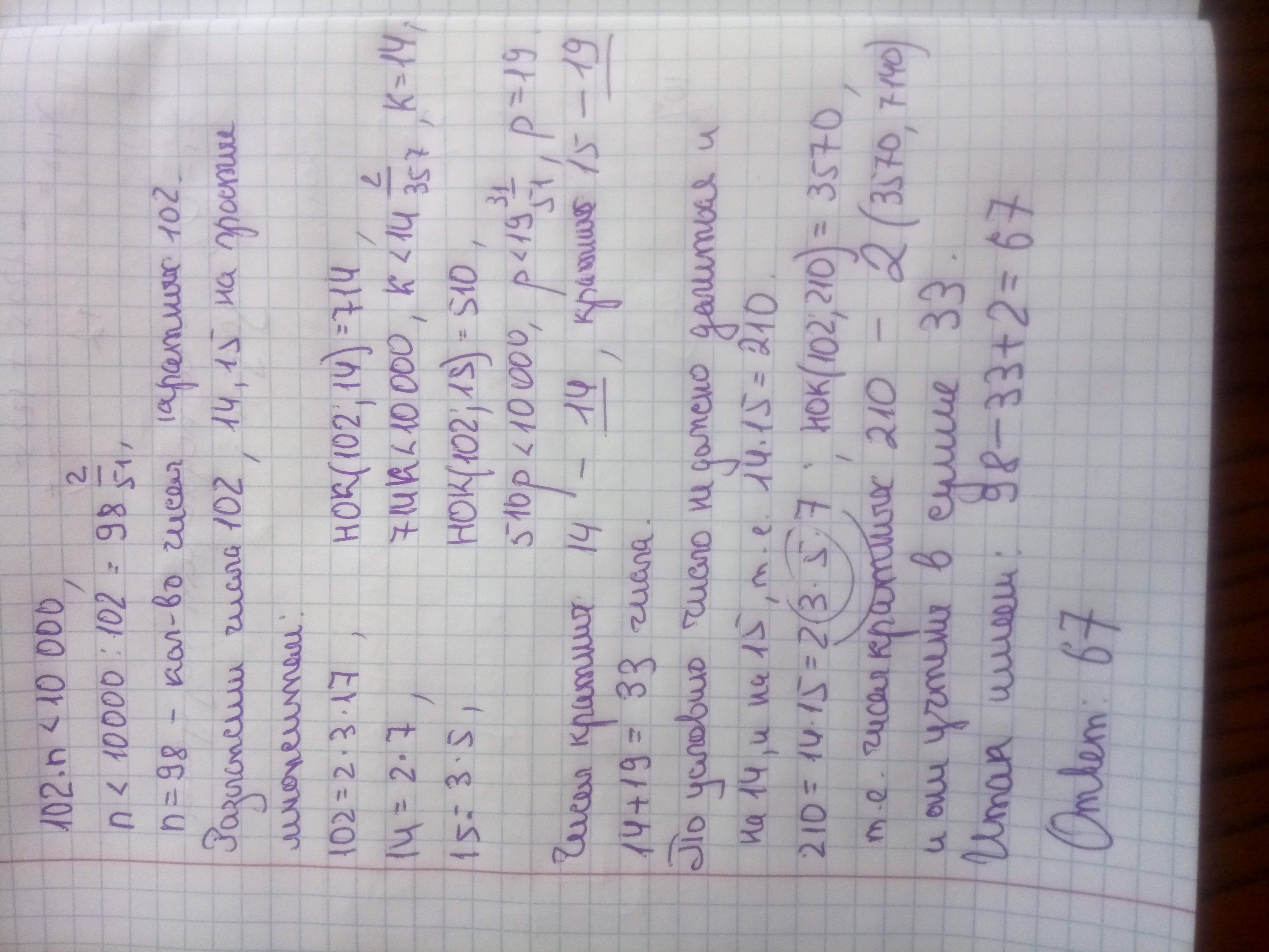 Перед нами последовательность чисел, каждое из которых делится на 102: {1·102; 2·102; 3·102; ... ; 98·102}. Узнаем, какие из этих чисел кратны 14 и 15.
