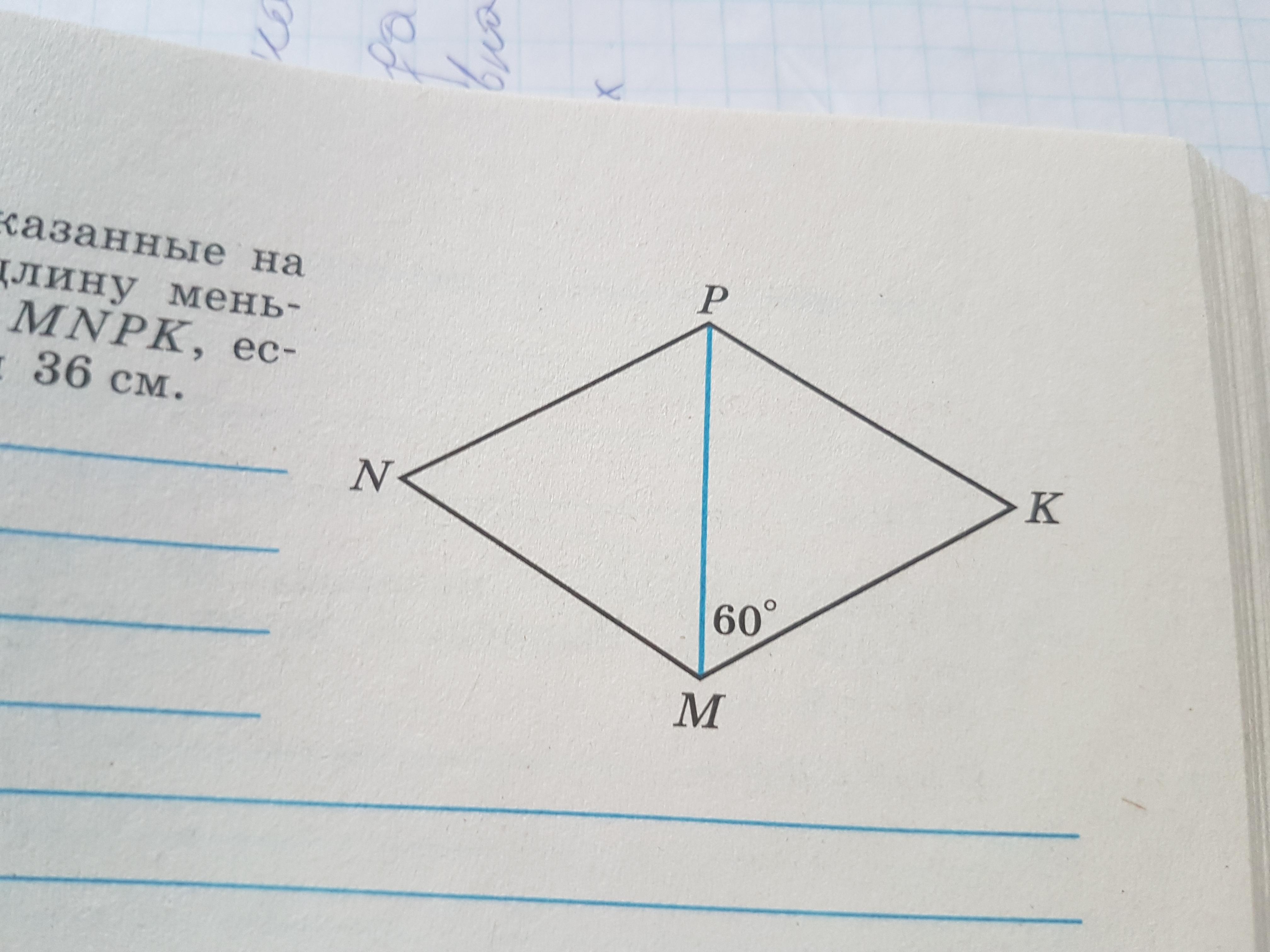 1) диагональ ромба является биссектрисой углов⇒ если ∠PMK=60, то ∠NMK=120, а углы ромба N и K=60 Итак, в ΔPMK все углы по 60⇒он равностор. и МР=9