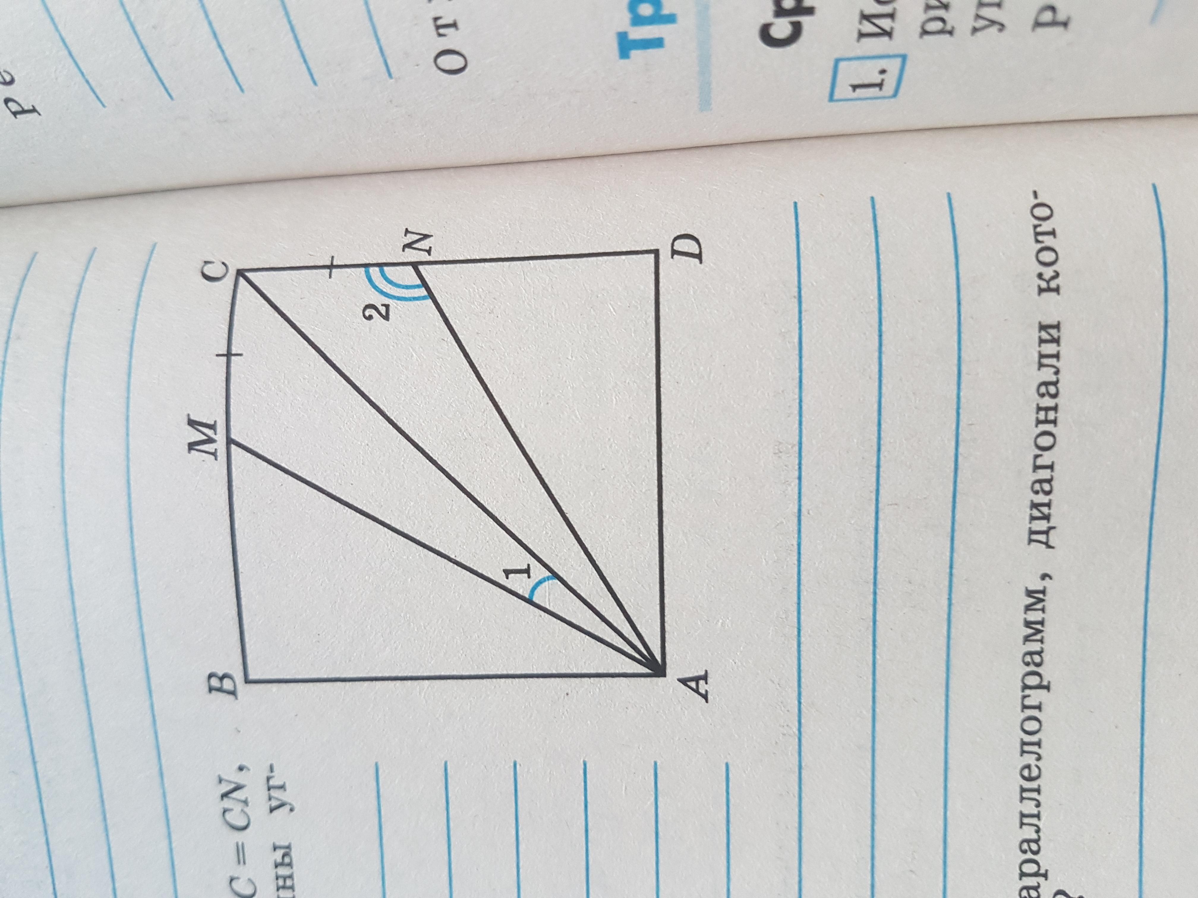 3. ABCD-квадрат, MC=CN, угол MAN=32 градуса. Вычислите величины углов 1 и 2.(Рисунок внизу)