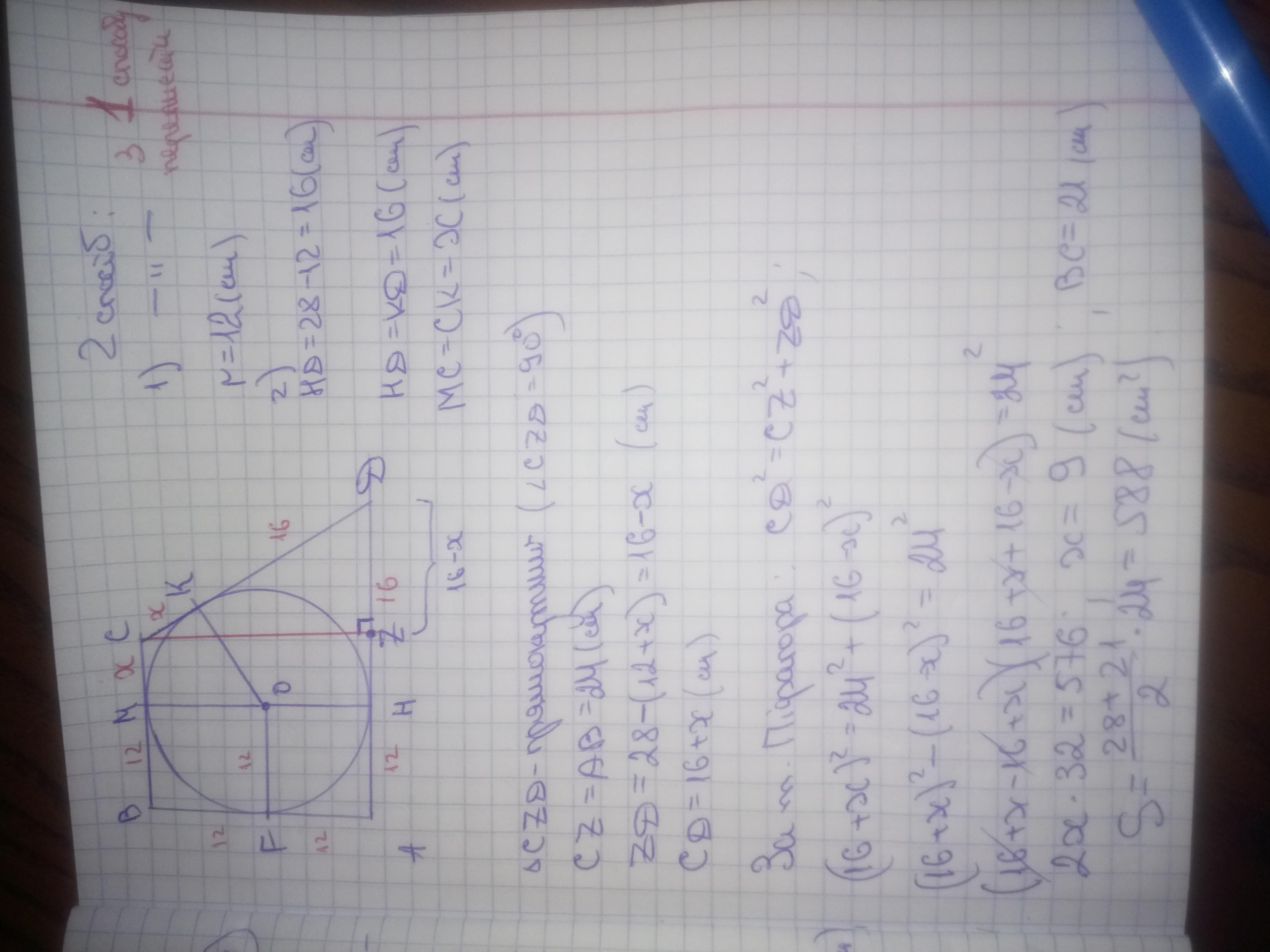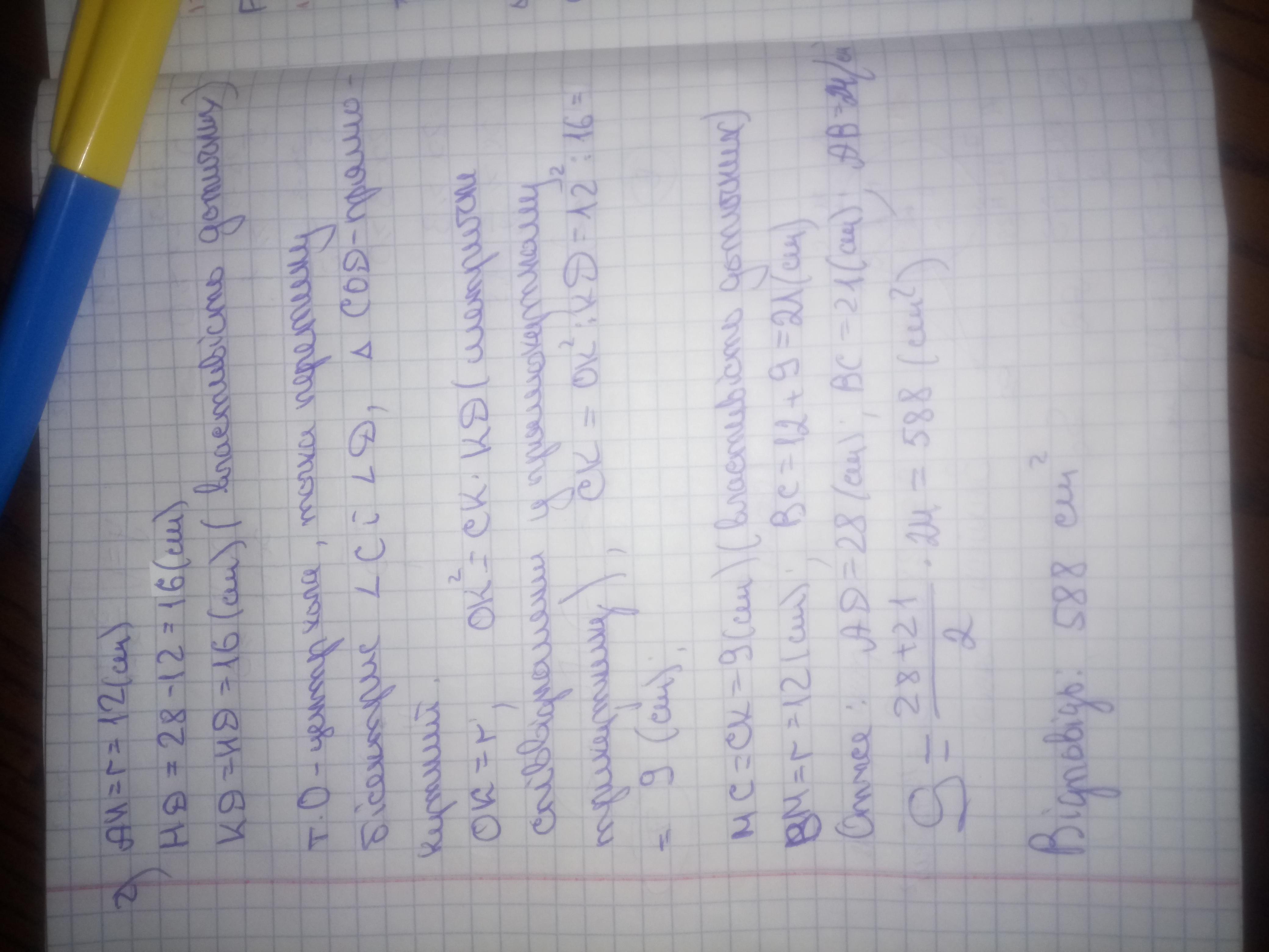 у прямокутній трапеції більша основа дорівнює 28 см . знайдіть площу цієї трапеції ,якщо площа кола вписаного в неї дорівнює 144п см2