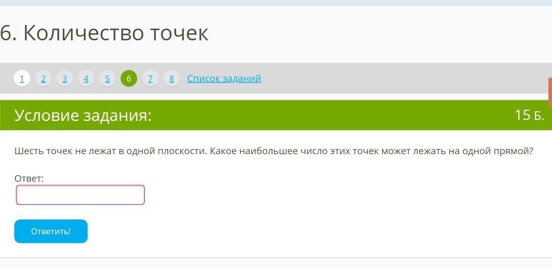 Шесть точек не лежат в одной плоскости, если хотя бы одна из них не лежит в плоскости остальных пяти точек (если такое возможно). Через прямую и не лежащую на ней точку можно провести единственную плоскость. Выберем такую прямую и точку. Тогда нам нужна ещё одна точка, чтобы выполнялось условие, что "шесть точек не лежат в одной плоскости". Оставшиеся четыре можно расположить на прямой, через которую проводили плоскость.