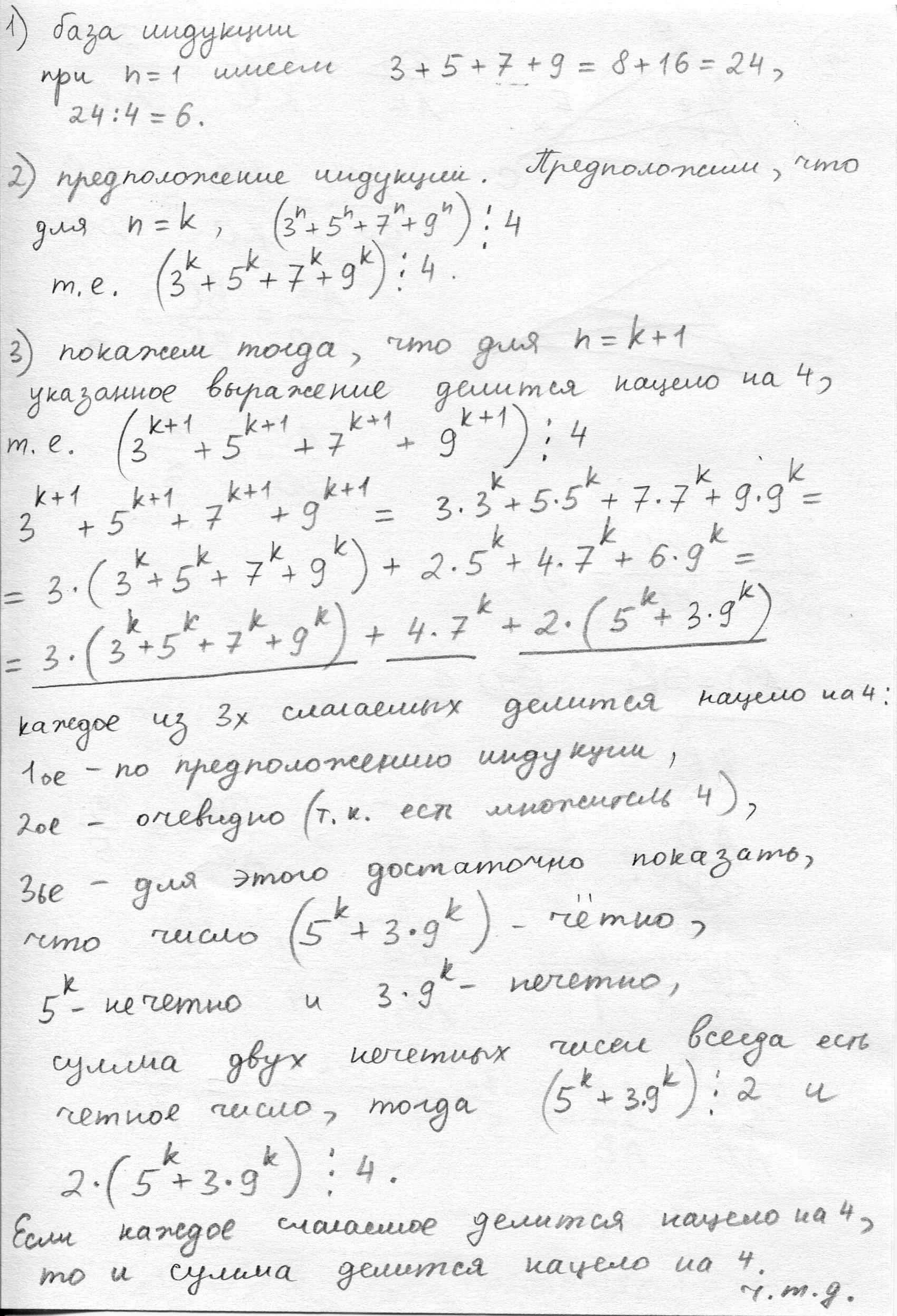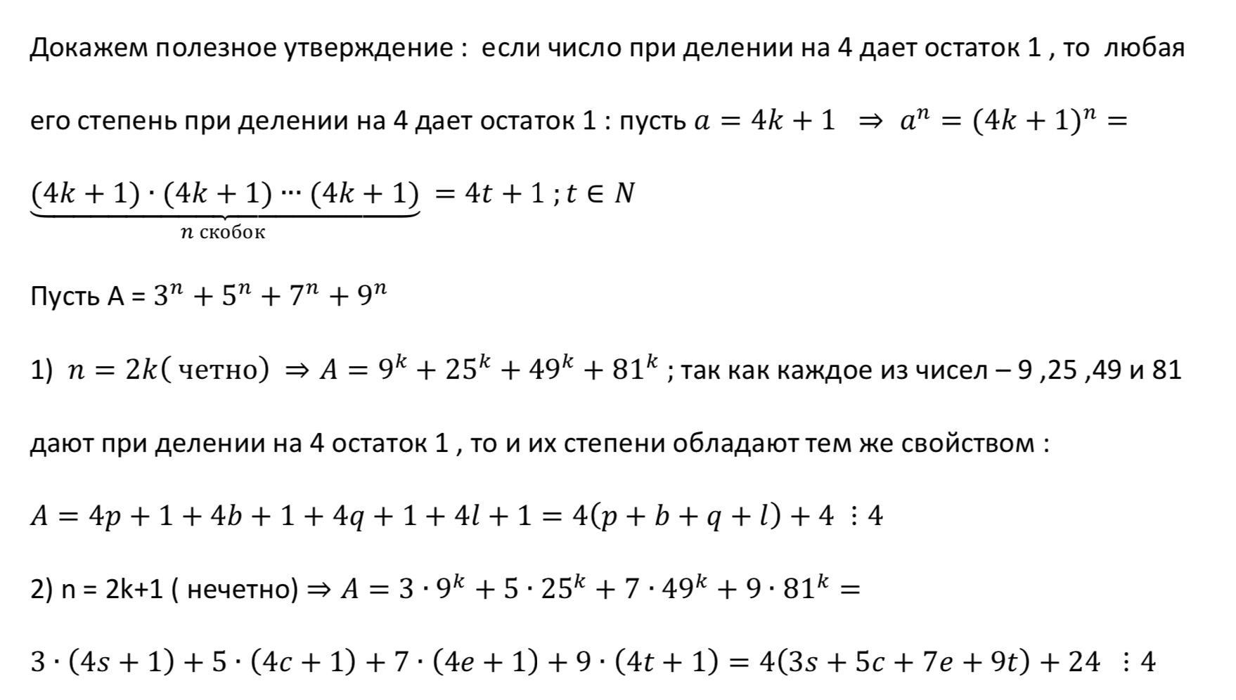 Докажите, что число, заданное выражением 3^n+5^n+7^n+9^n , кратно 4 при любом натуральном n.