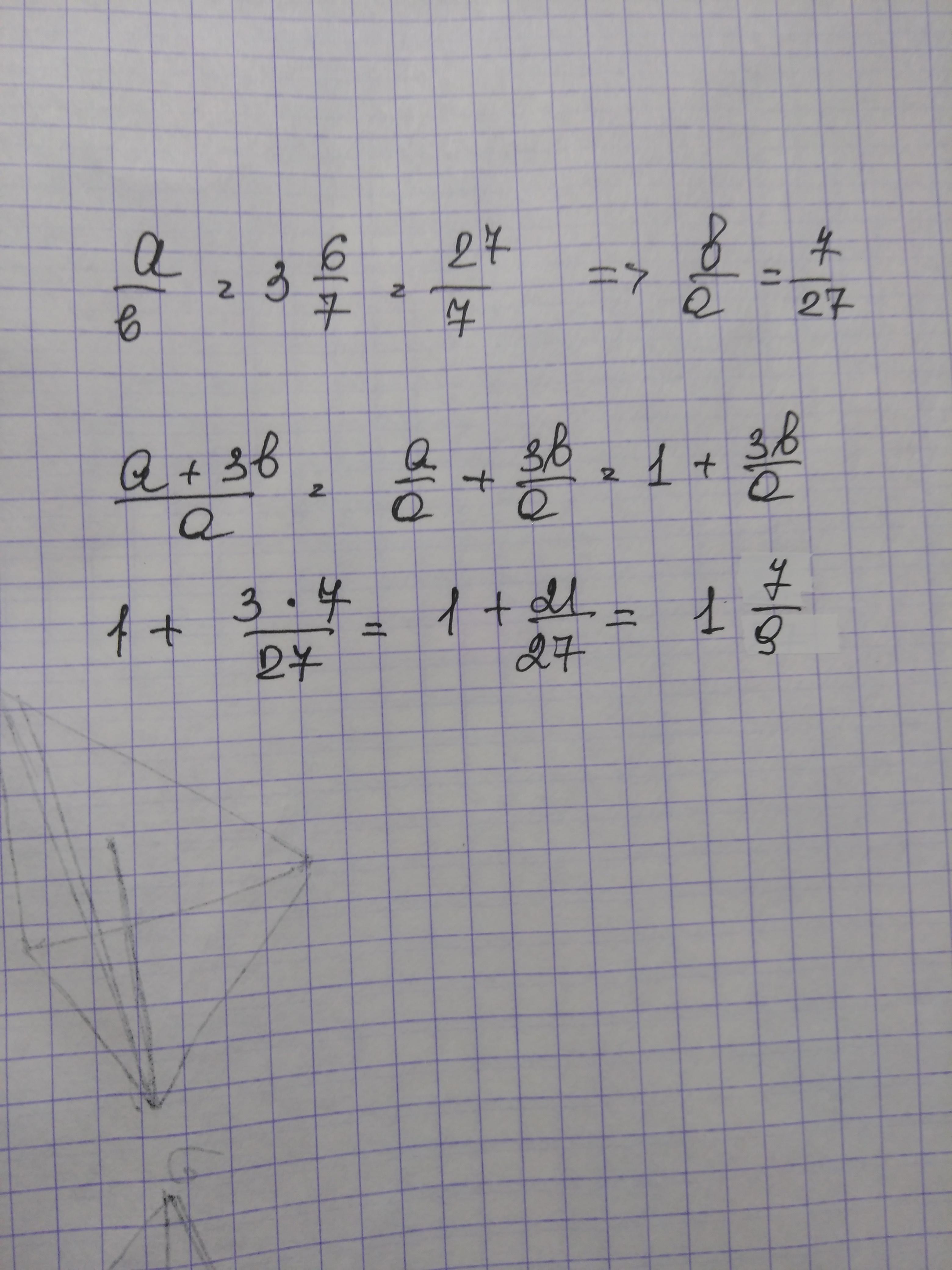 Отношение a/b равно 3 6/7 найдите отношение a+3b/a