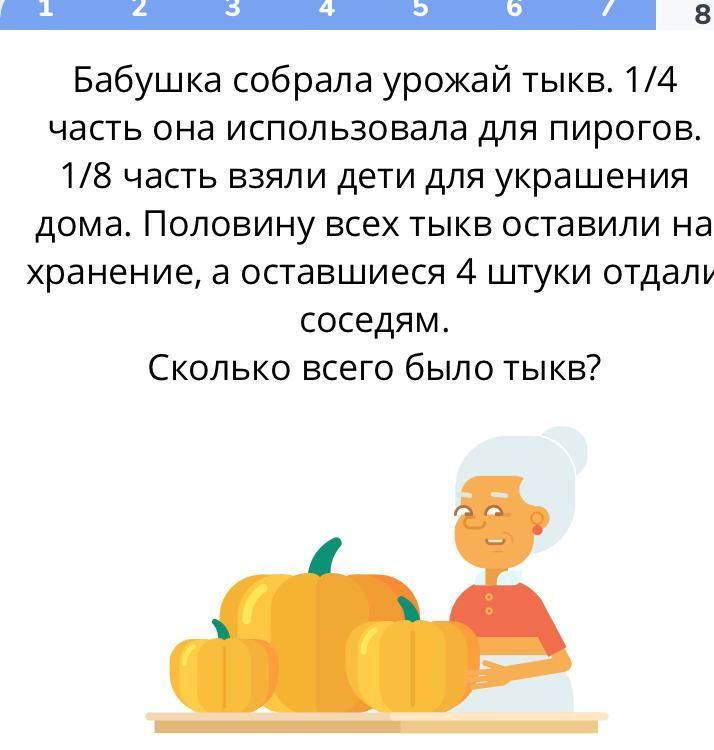 Если 4 тыквы это одна восьмая урожая значит, урожай - это 4 * 8 = 32 тыквы
