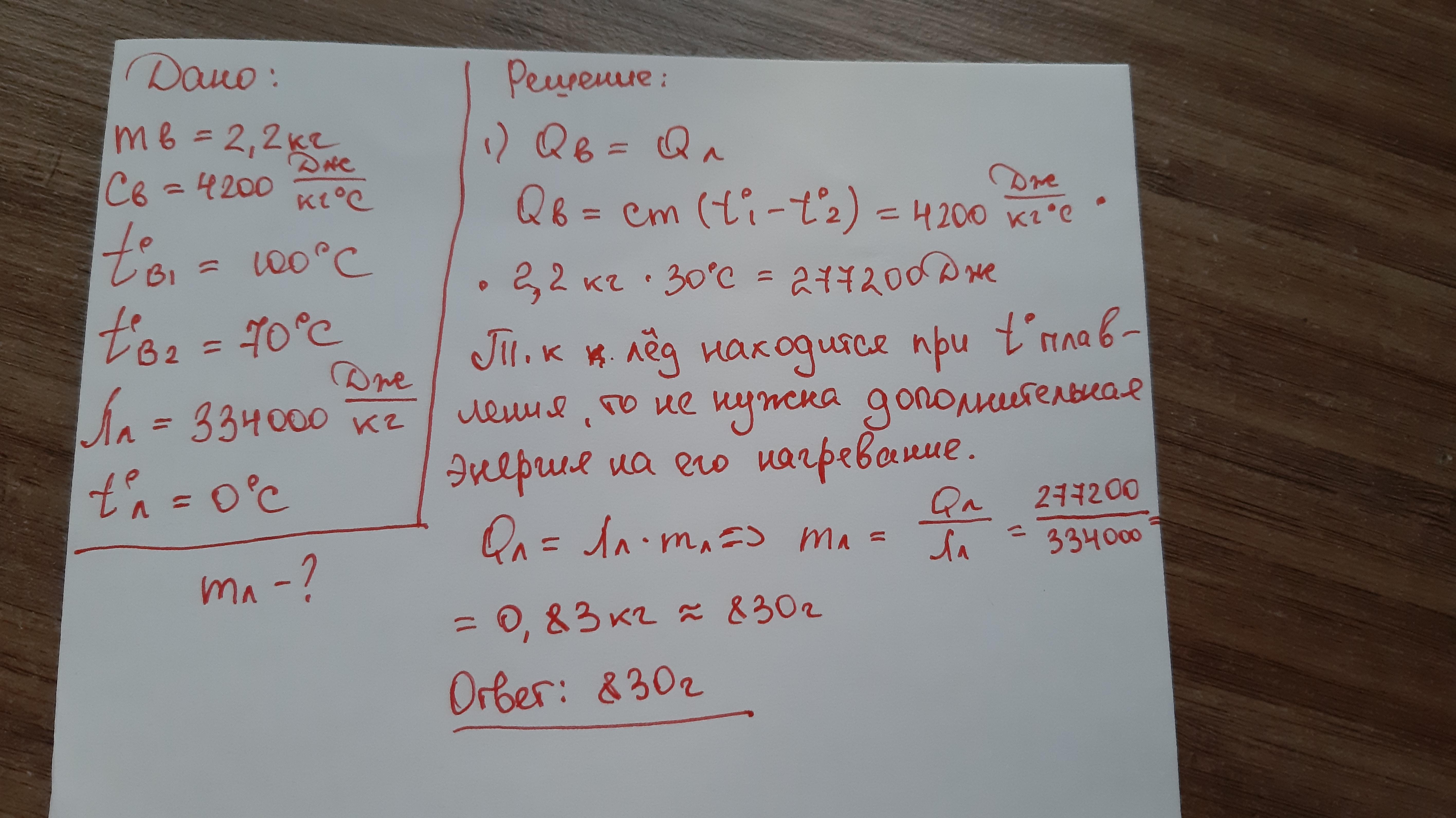 Энергия, выделяющаяся при остывании 2,2 кг горячей воды, нагретой до 100 °С, идёт только на плавление льда, взятого при температуре 0 °С. Какова масса расплавленного льда, если вода остыла до 70 °С? Потерями энергии в окружающую среду пренебречь.