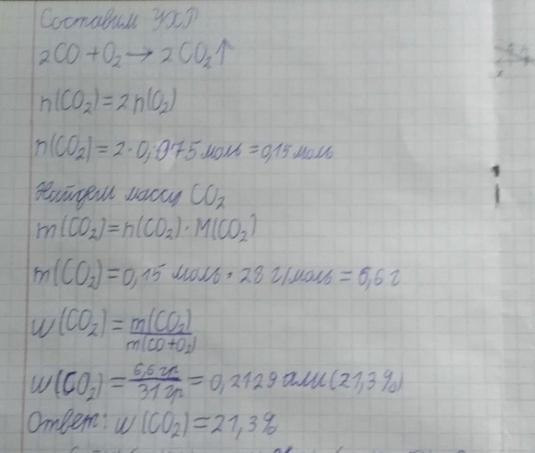 ω(СО₂) = m(CO₂)/m(CO+O₂) = 6,6 г/31 г = 0,2129 или 21,3%