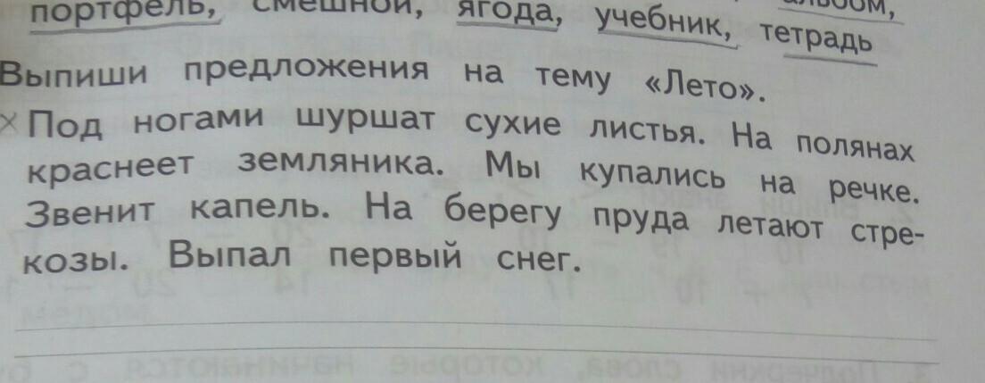 На полянах краснеют земляника. Мы купались на речке. На берегу пруда летают стрекозы.