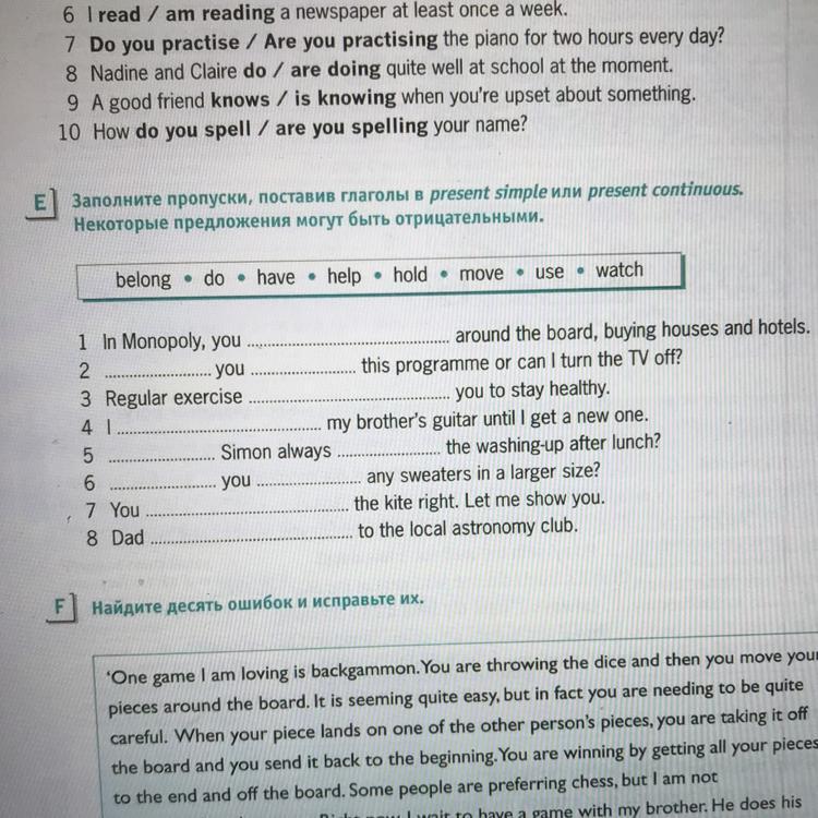 E) Заполните пропуски, поставив глаголы в present simple или present continuous. Некоторые предложения могут быть отрицательными.