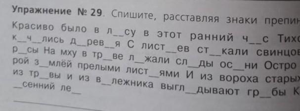 Красиво было в лесу в этот ранний час. Тихо шумели, качались деревья. С листьев стекали свинцовые капли росы. На мху в траве лежали следы осени. Остро пахло сырой землёй, прелыми листьями. И из вороха старых листьев, и из травы, и из валежника выглядывают грибы. Как красив осенний лес!