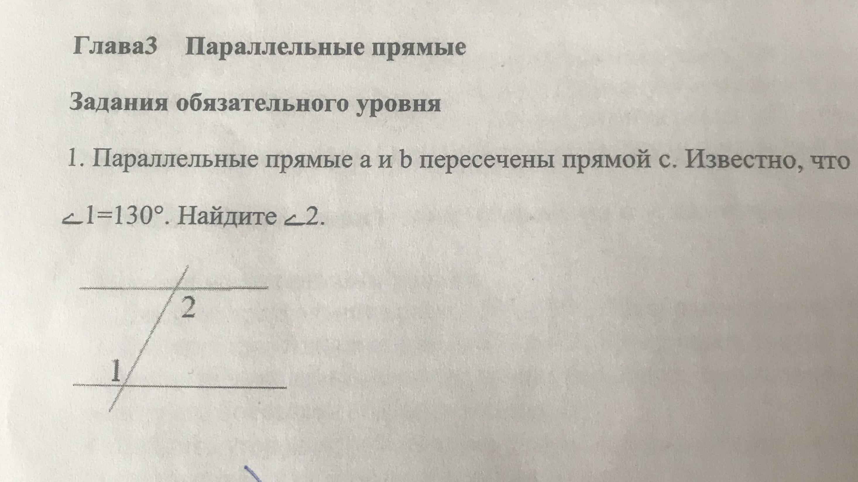 Параллельные прямые а и b пересечены прямой c. Известно что угол 1 равен 130 градусам. Найдите угол 2