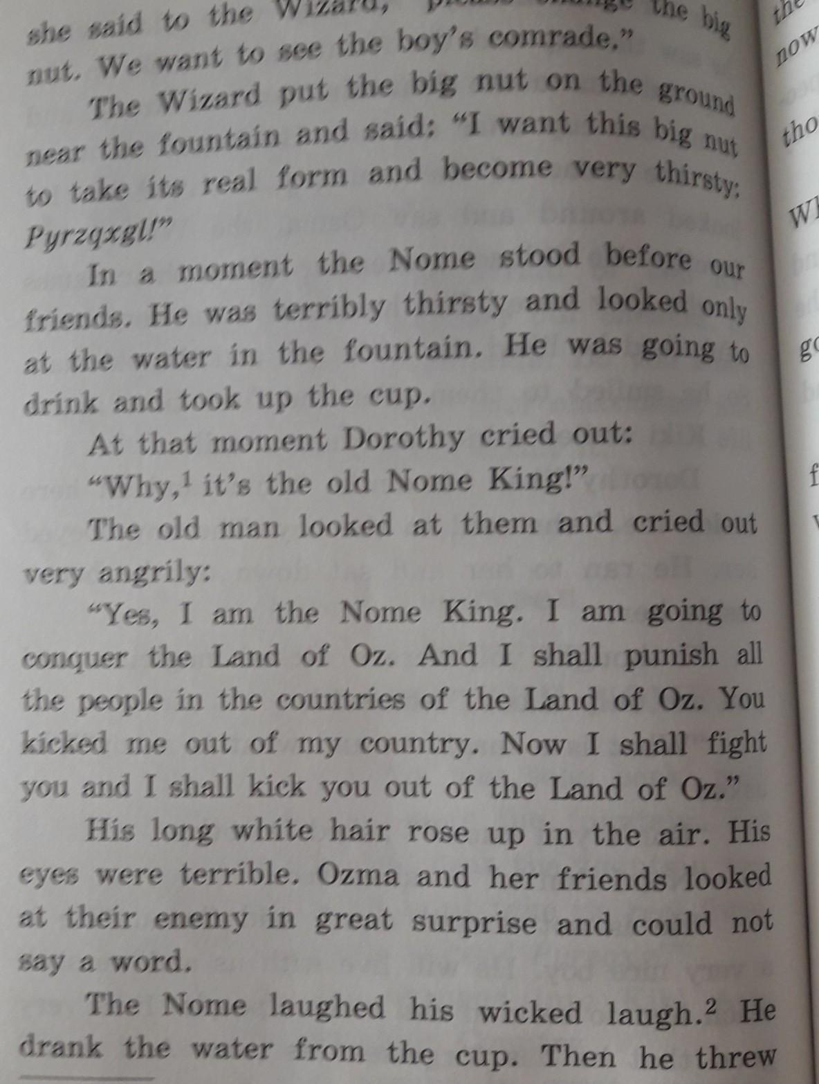 «Да, я Король Гномов. Я собираюсь завоевать Страну Оз. И я накажу всех людей этой страны. Ты выгнал меня из моей страны. Но я сражусь с тобой и вышвырну тебя из Страны Оз.»