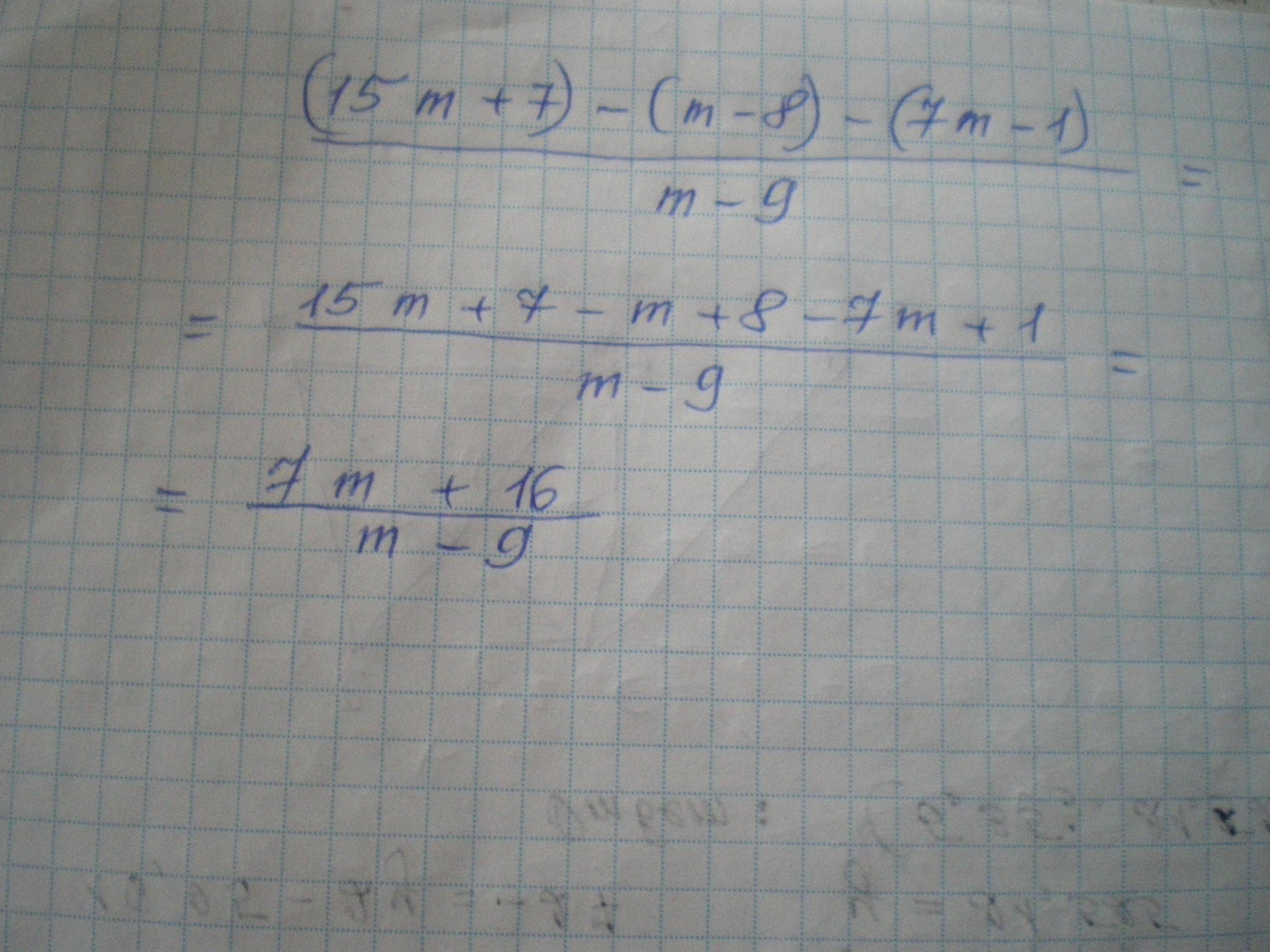 Упрости выражение (15m+7)−(m-8)−(7m-1)/(m-9)