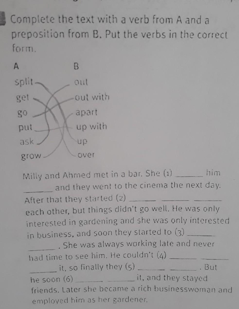 Milly and Ahmed met in a bar. She (1) ask him out and they went to the cinema the next day. After that they started (2) going out with each other, but things didn't go well. He was only interested in gardening and she was only interested in business, and soon they started to (3) grow apart. She was always working late and never had time to see him. He couldn't (4) put up with it, so they (5) finally split up. But he soon (6) got over it, and they stayed friends. Later she became a rich businesswoman and employed him as her gardener.