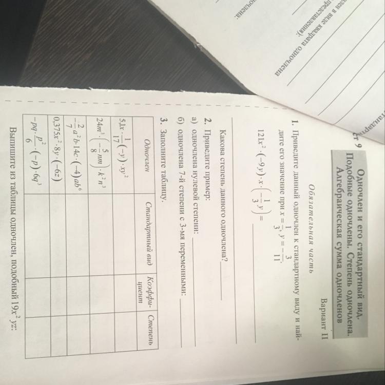 Одночлен 7-й степени с 3-мя переменными, например: x²y³z², где степень одночлена равен сумме данных показателей: 2+3+2=7.