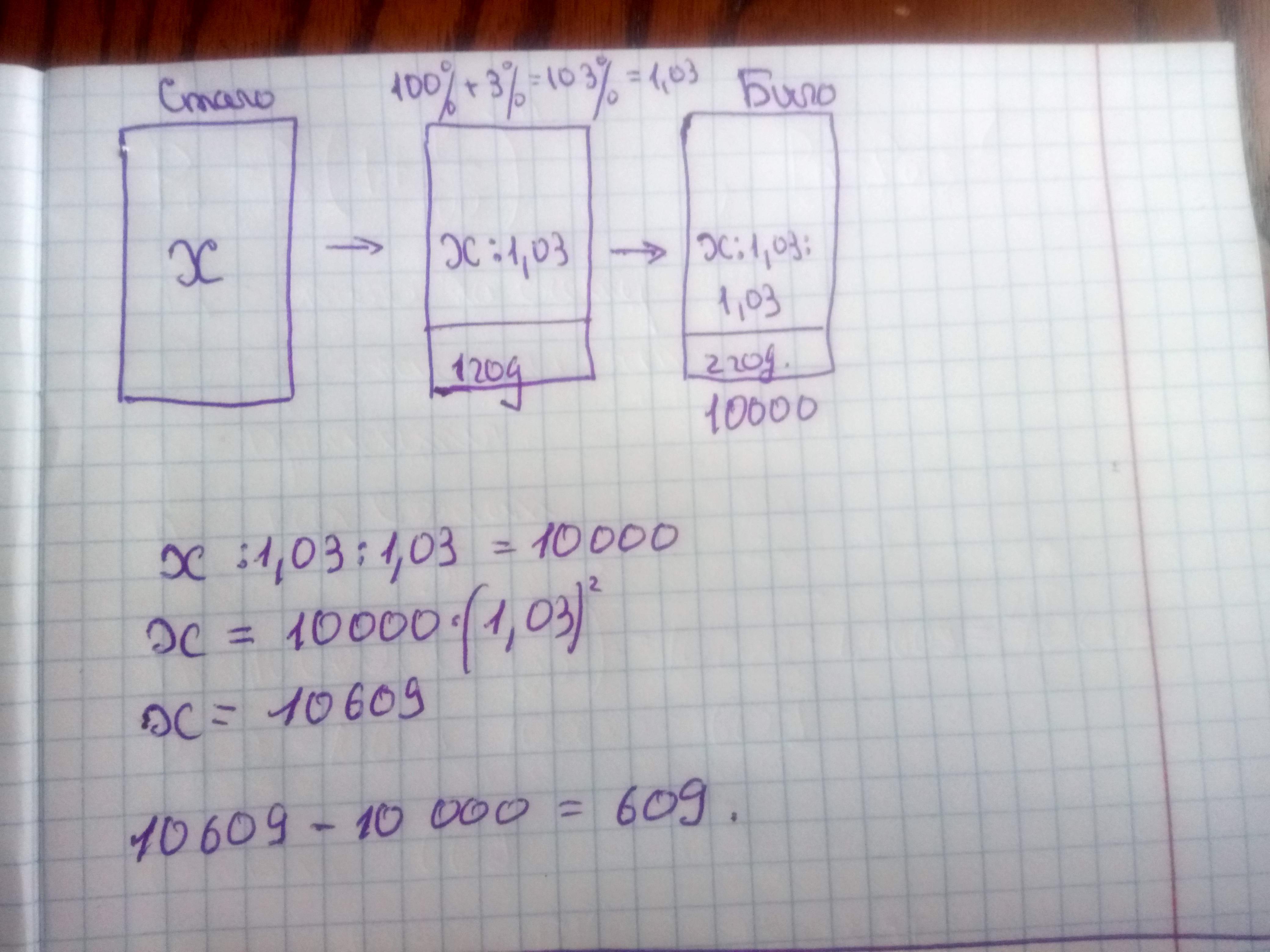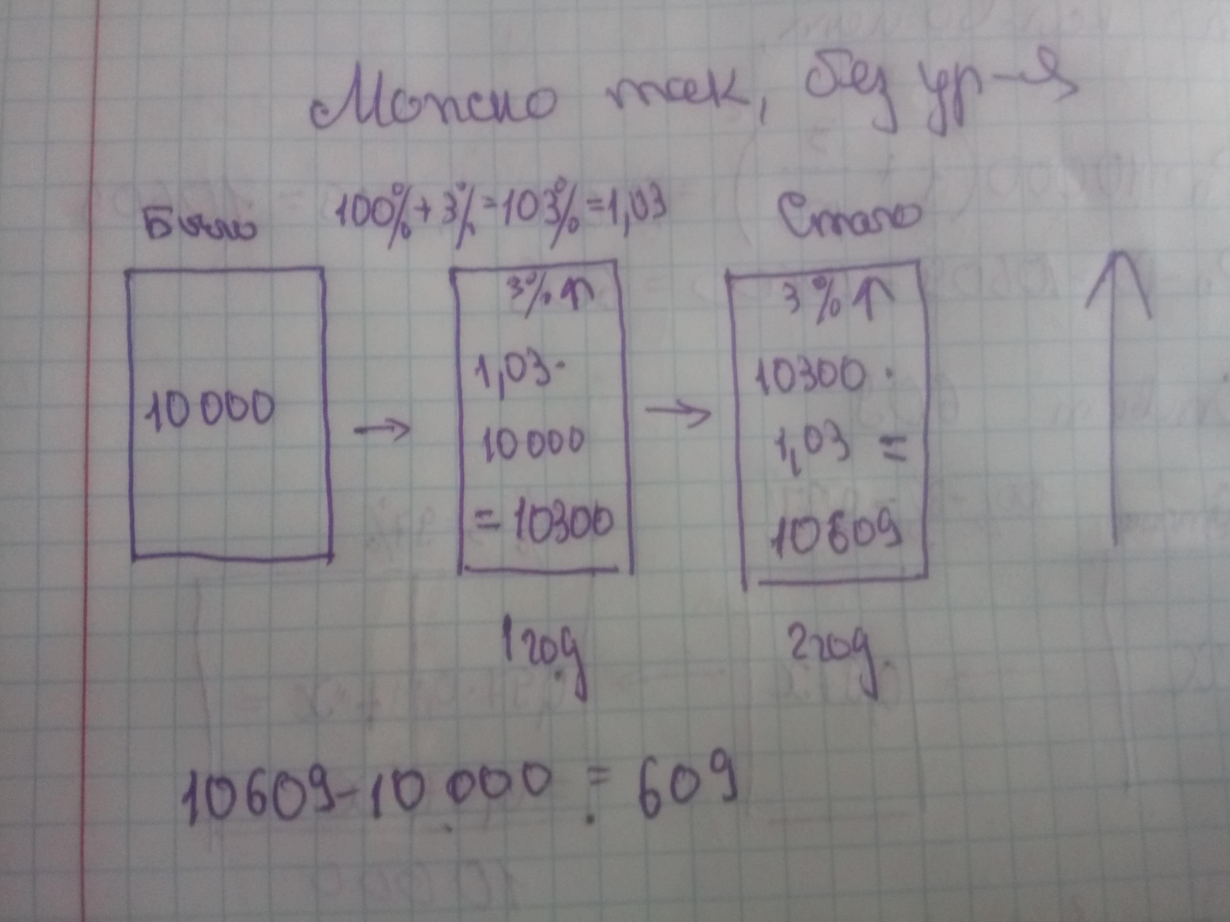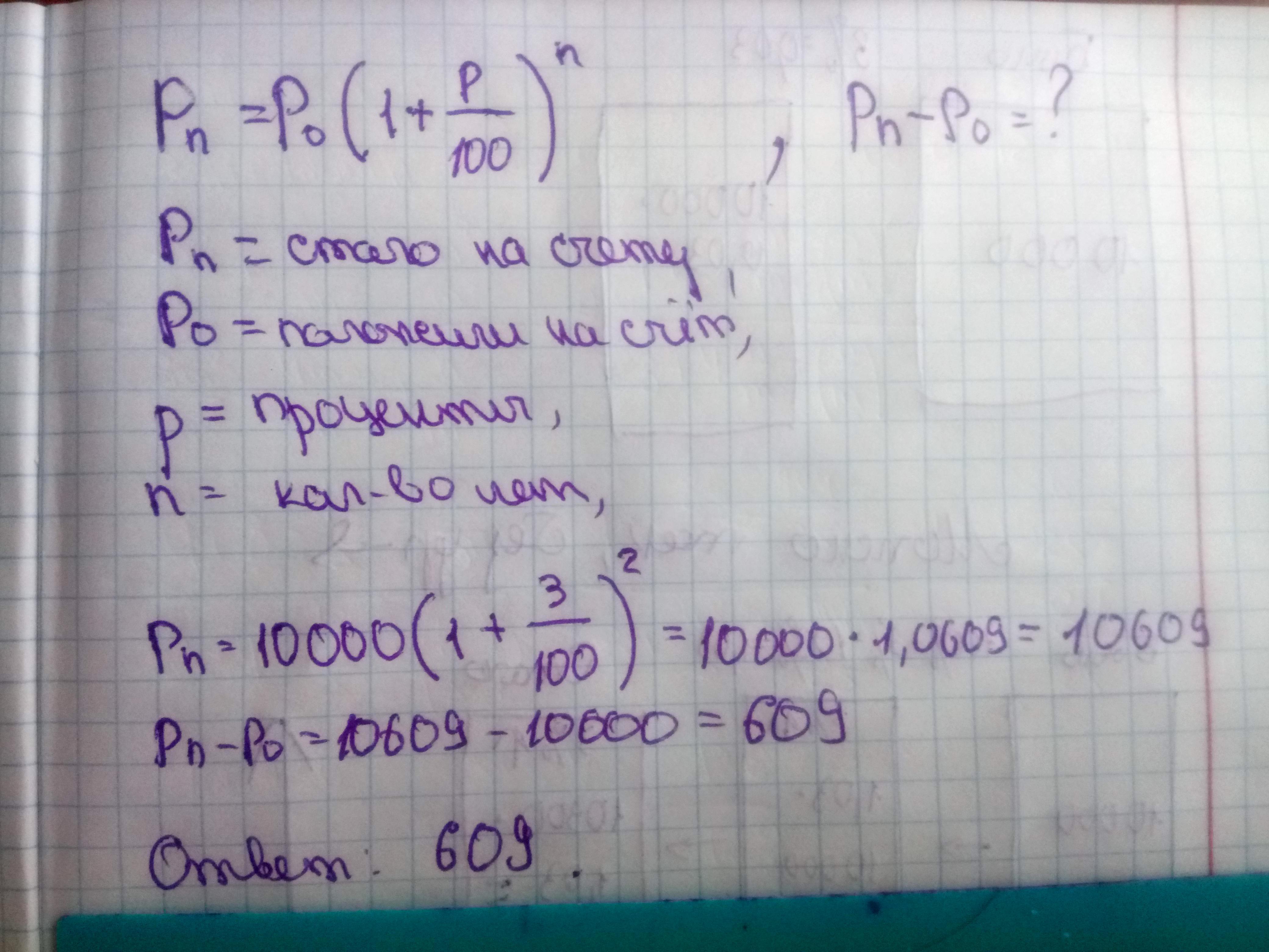 Сберегательный банк в конце года начисляет 3% к сумме находившийся на счету. На сколько рублей увеличится первоначальный вклад в 10000 рублей через 2 года | пожалуйста срочно надо, и если сможете сделать этим способом.