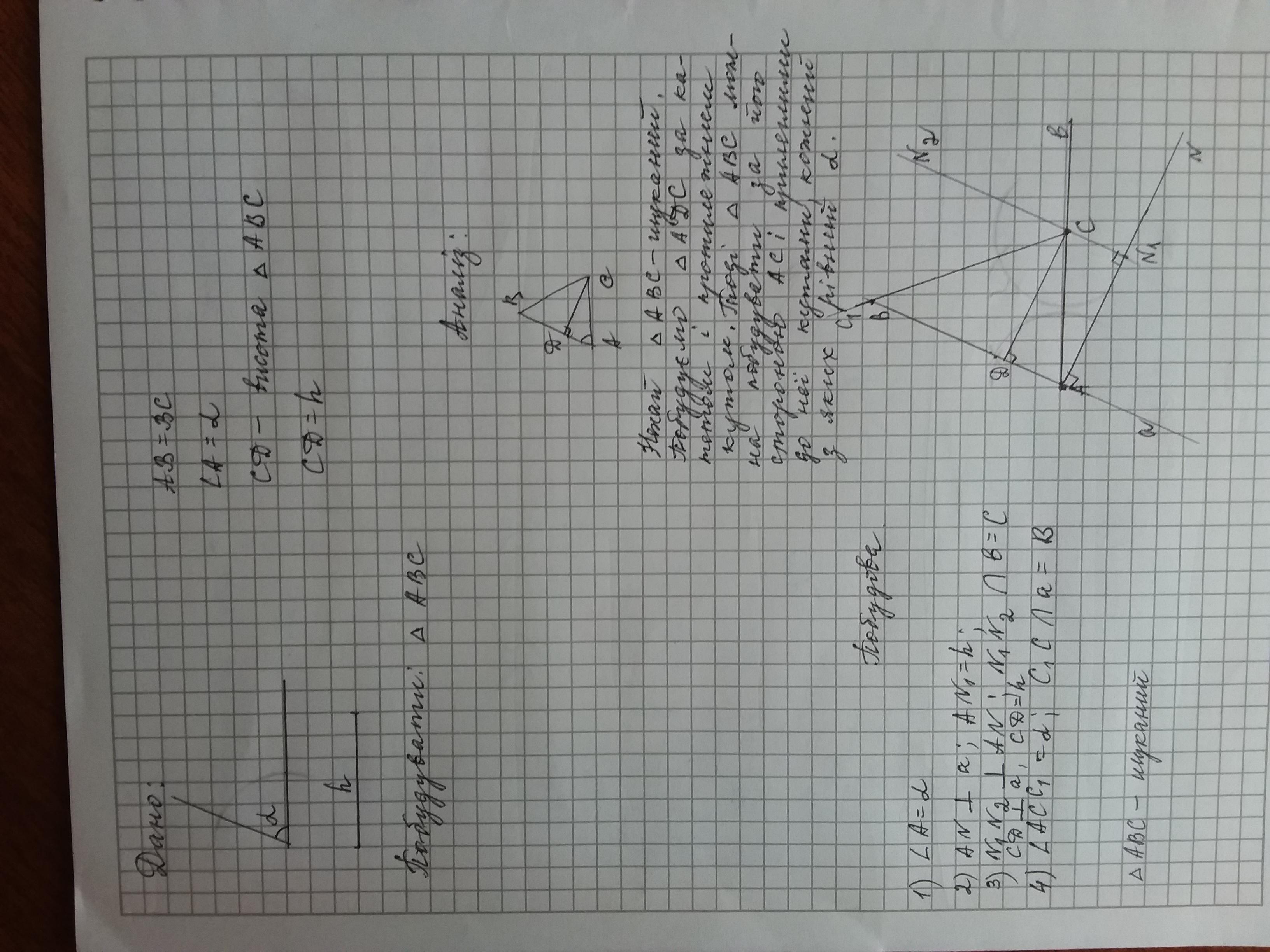 побудуйте рывнобедрений трикутник за кутом при основі та висоті проведеній до бічної сторони