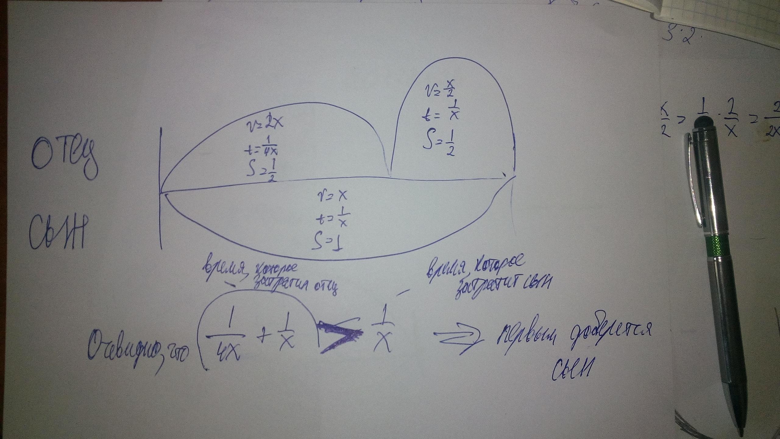Папа с сыном начинают движение из п.А в п.В. Первую половину пути папа идёт в два раза быстрее сына, а вторую половину- в два раза медленнее. Кто первым доберётся в п.В?