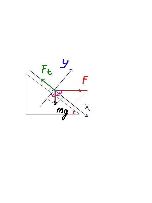 Все отмеченные углы=45 градусов тогда силы F , mg, с осями имеют углы по 45 градусов. А их проекции на оси по правилу диагонали квадрата :