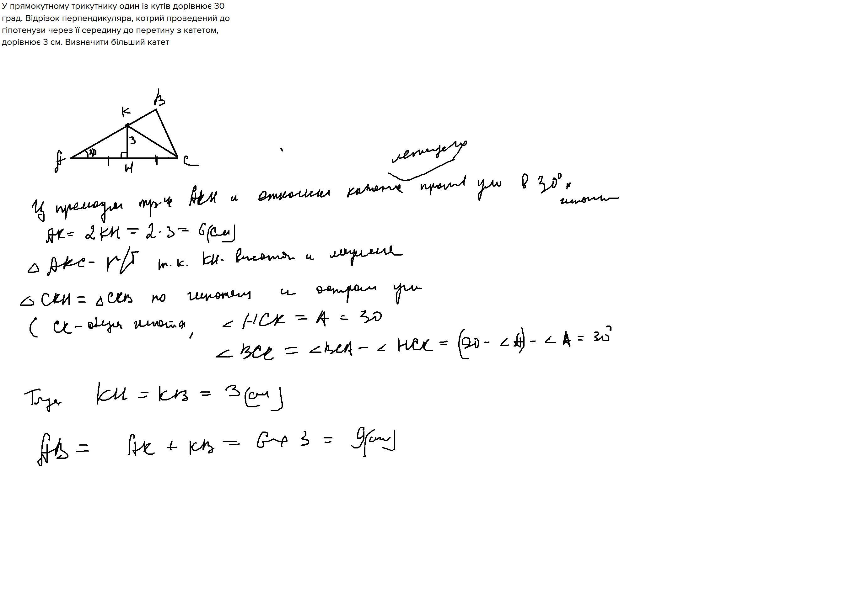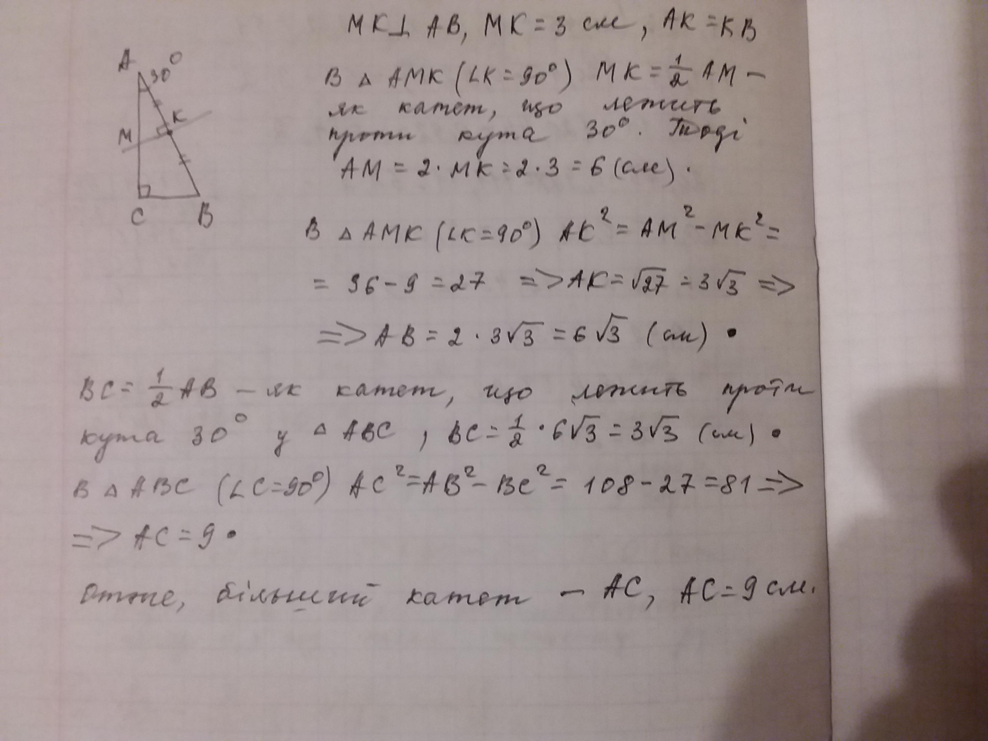 У прямокутному трикутнику один із кутів дорівнює 30 град. Відрізок перпендикуляра, котрий проведений до гіпотенузи через її середину до перетину з катетом, дорівнює 3 см. Визначити більший катет трикутника.(8-9 клас, можна українською або російською)