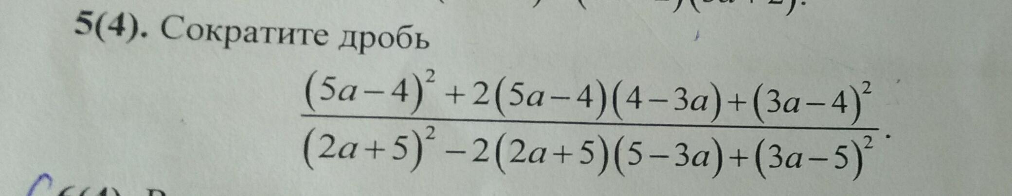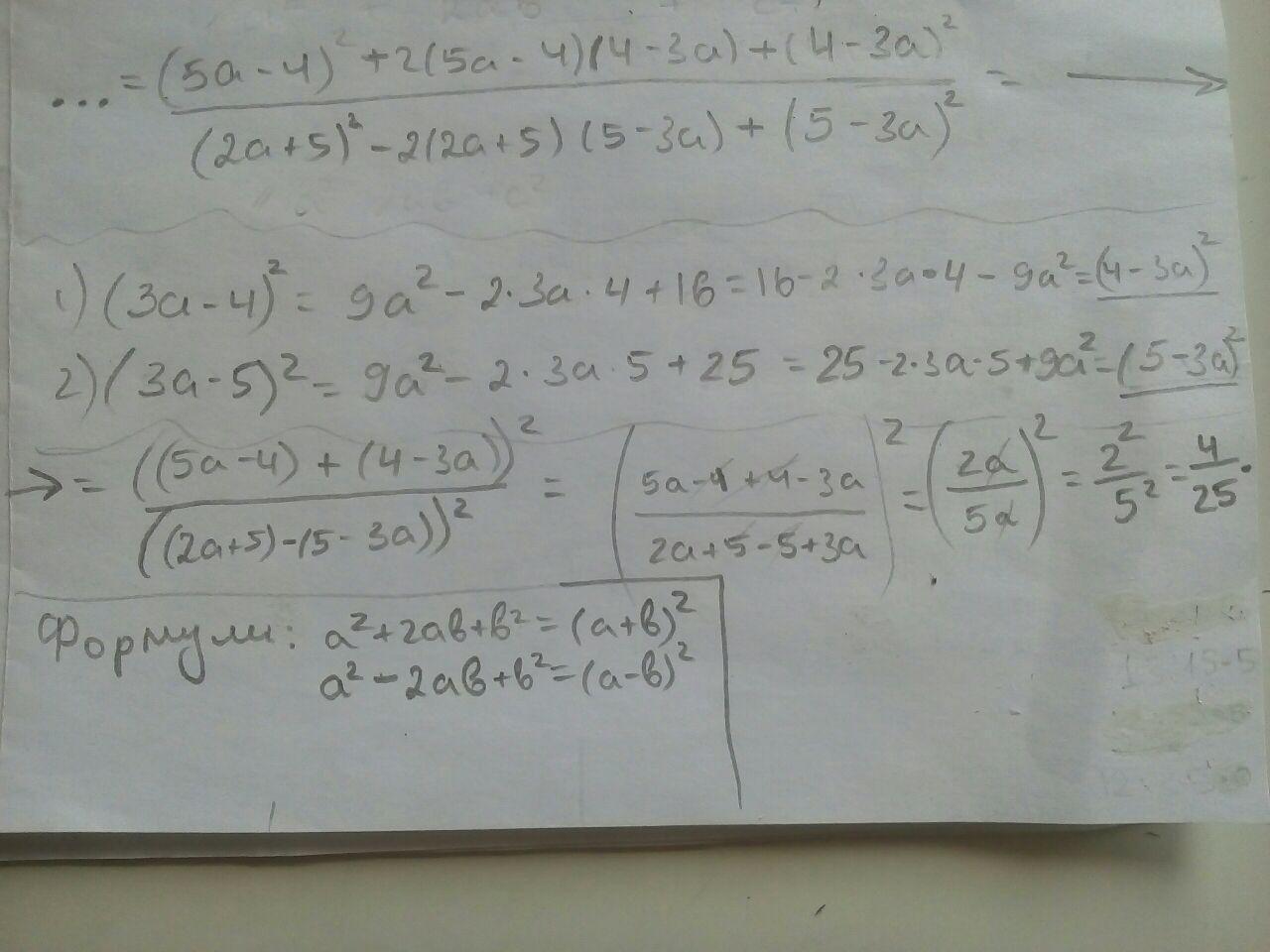 Да здесь решение на 1 строчку. Формула сокращённого умножения. =(5а-4+4-3а)^2/(2а+5-5+3а)^2=(2а/5а)^2=4/25=0,16