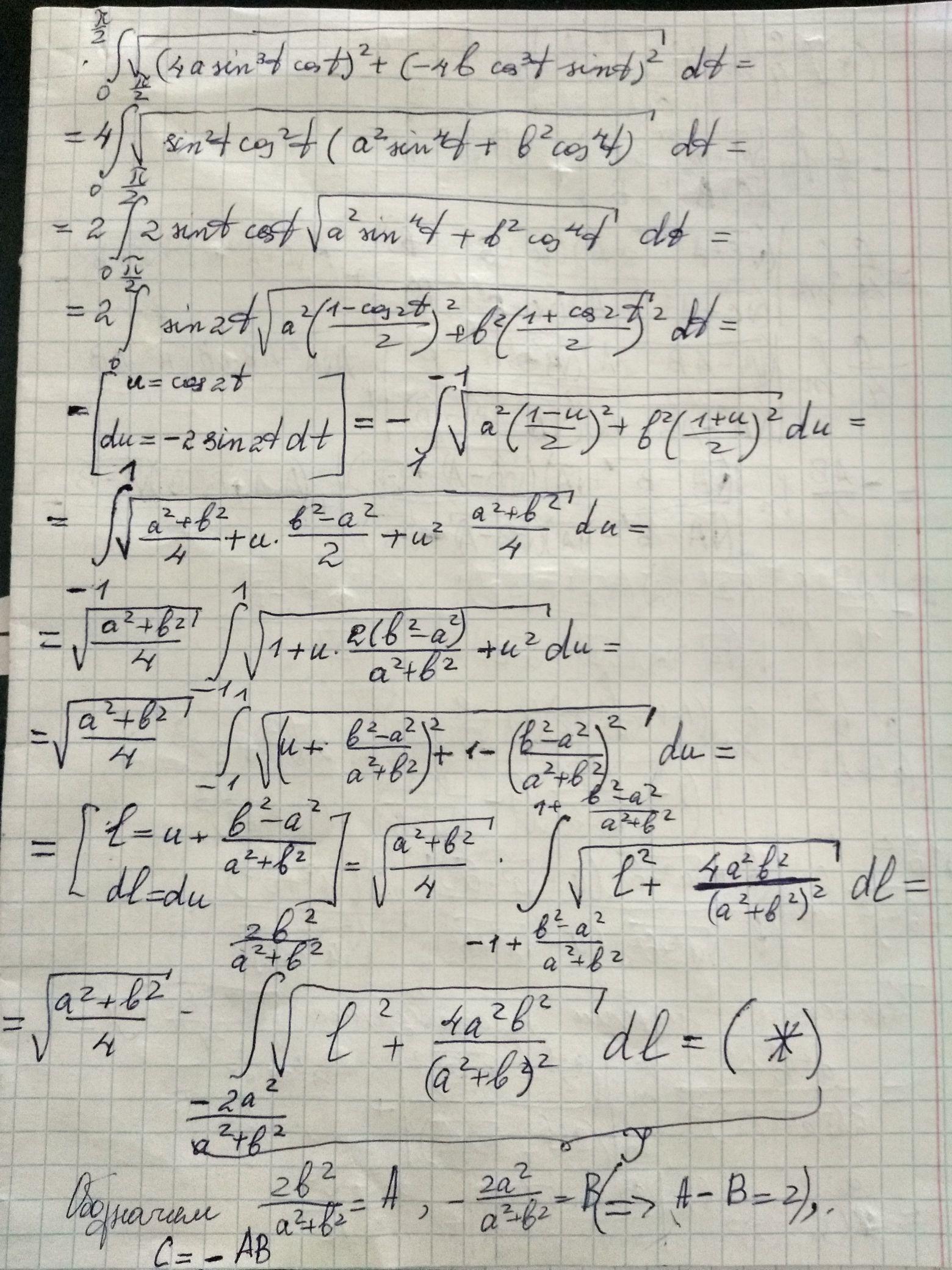 Вычисление длины кривой на фото 1 и 2. На 3 фото вычисление вспомогательного интеграла.
