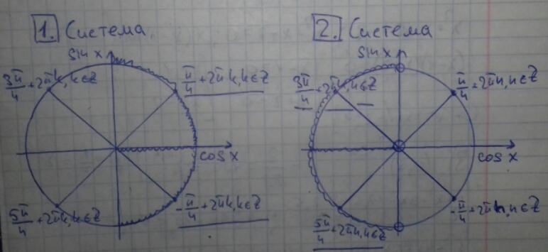 Это можно определить, как по записи множества значений x, так и по точкам на круге, являющимися решением.