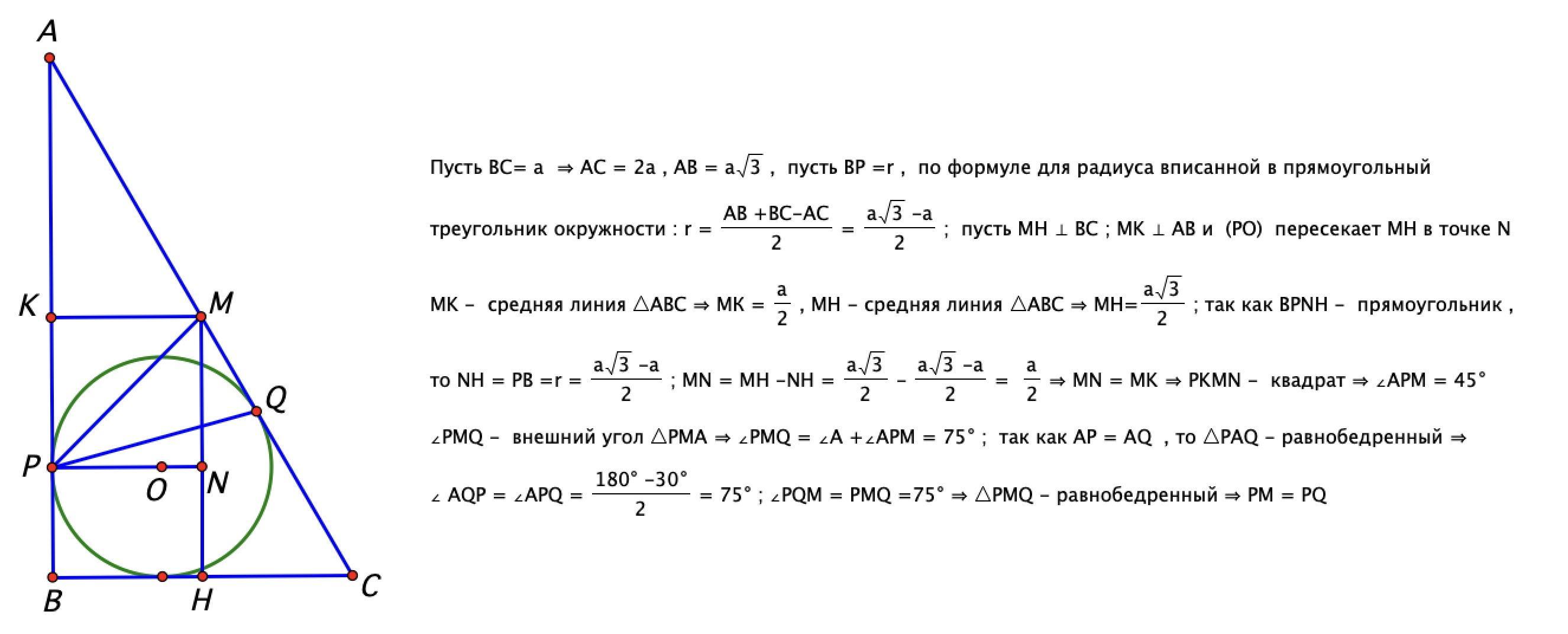 У трикутнику ABC ∠B = 900 , ∠A = 300 . Вписане коло дотикається до сторони АВ у точці Р, а до сторони АС – у точці Q; M — середина сторони AC. Доведіть, що PM = PQ.