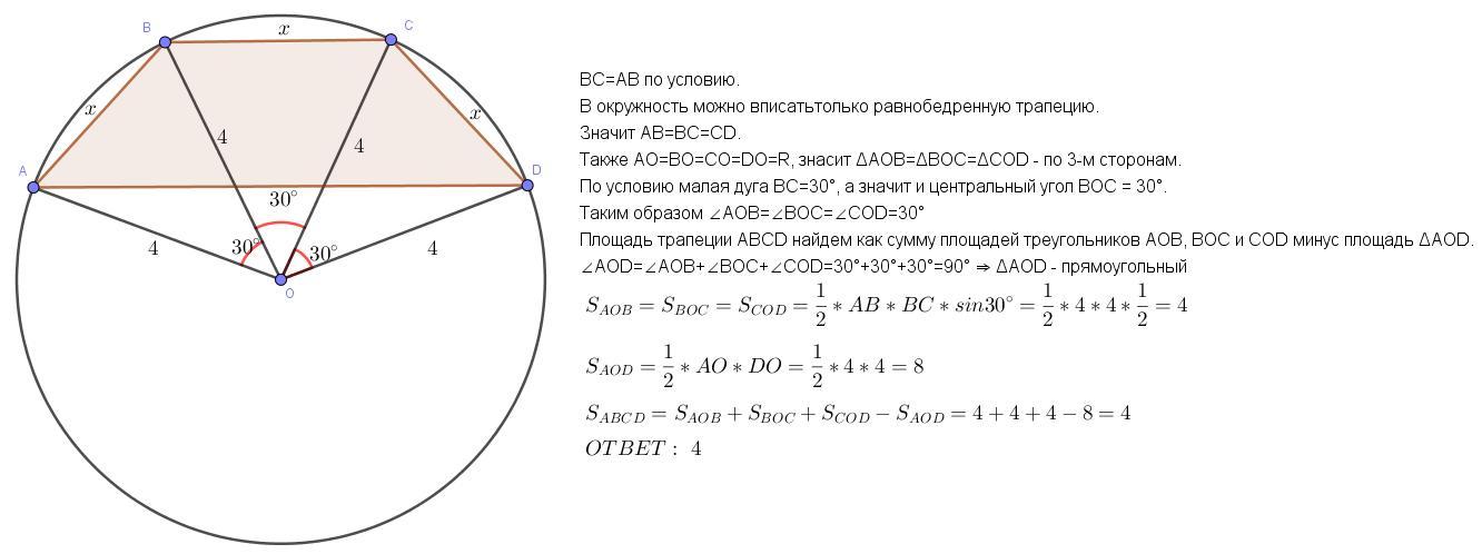 В окружности радиуса 4 вписана трапеция, у которой боковая сторона равна меньшему основанию, а угловая мера дуги стягиваемая этим основанием равна 30° Найдите площадь трапеции