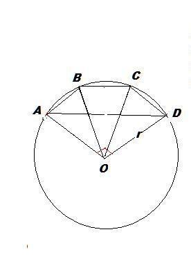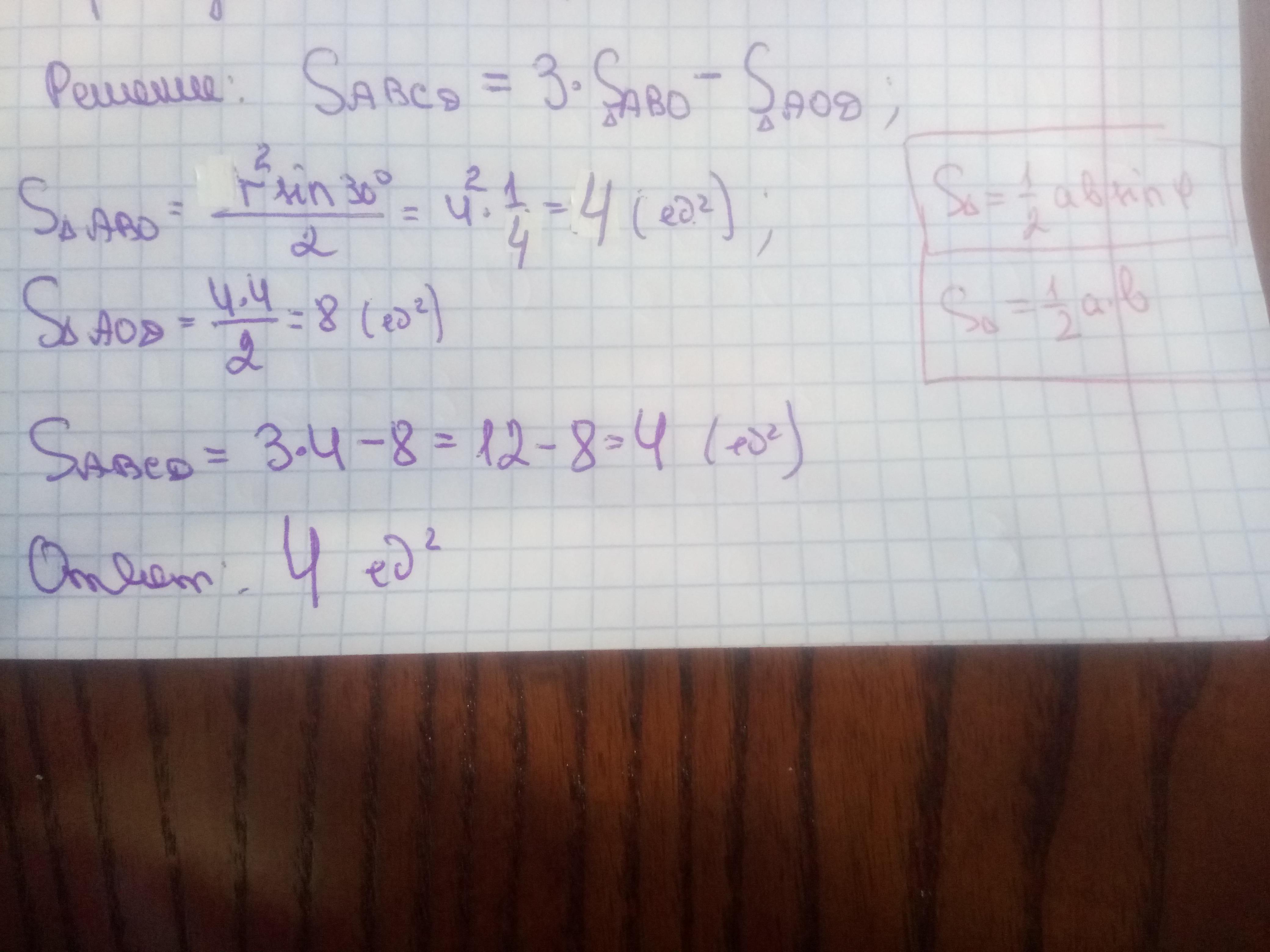 В окружности радиуса 4 вписана трапеция, у которой боковая сторона равна меньшему основанию, а угловая мера дуги стягиваемая этим основанием равна 30° .Найдите площадь трапеции