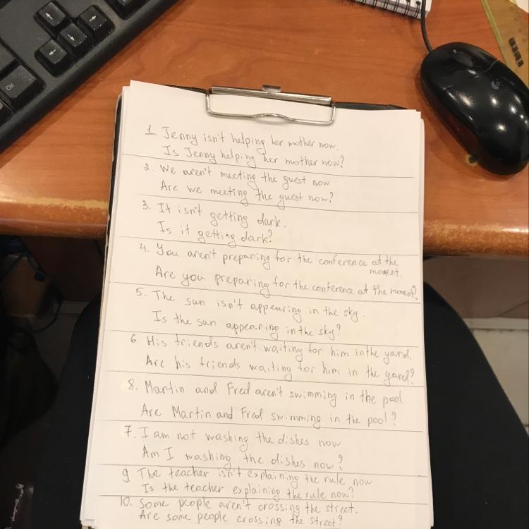 1) Jenny is helping her mother now. 2) We are meeting the guests now. 3) It is getting dark. 4) You are preparing for the conference at the moment. 5) The sun is appearing in the sky. 6) His friends are waiting for him in the yard. 7) I am washing the dishes now. 8) Martin and Fred are swimming in the pool. 9) The teacher is explaining the rule now. 10) Some people are crossing the street.