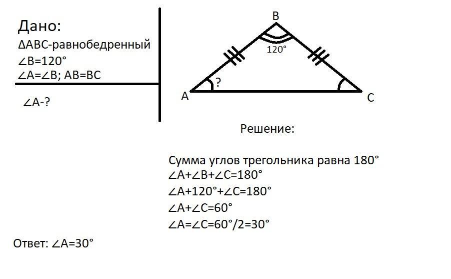 В равнобедренном треугольнике угол при вершине равен 120°. Вычислите угол при основании.