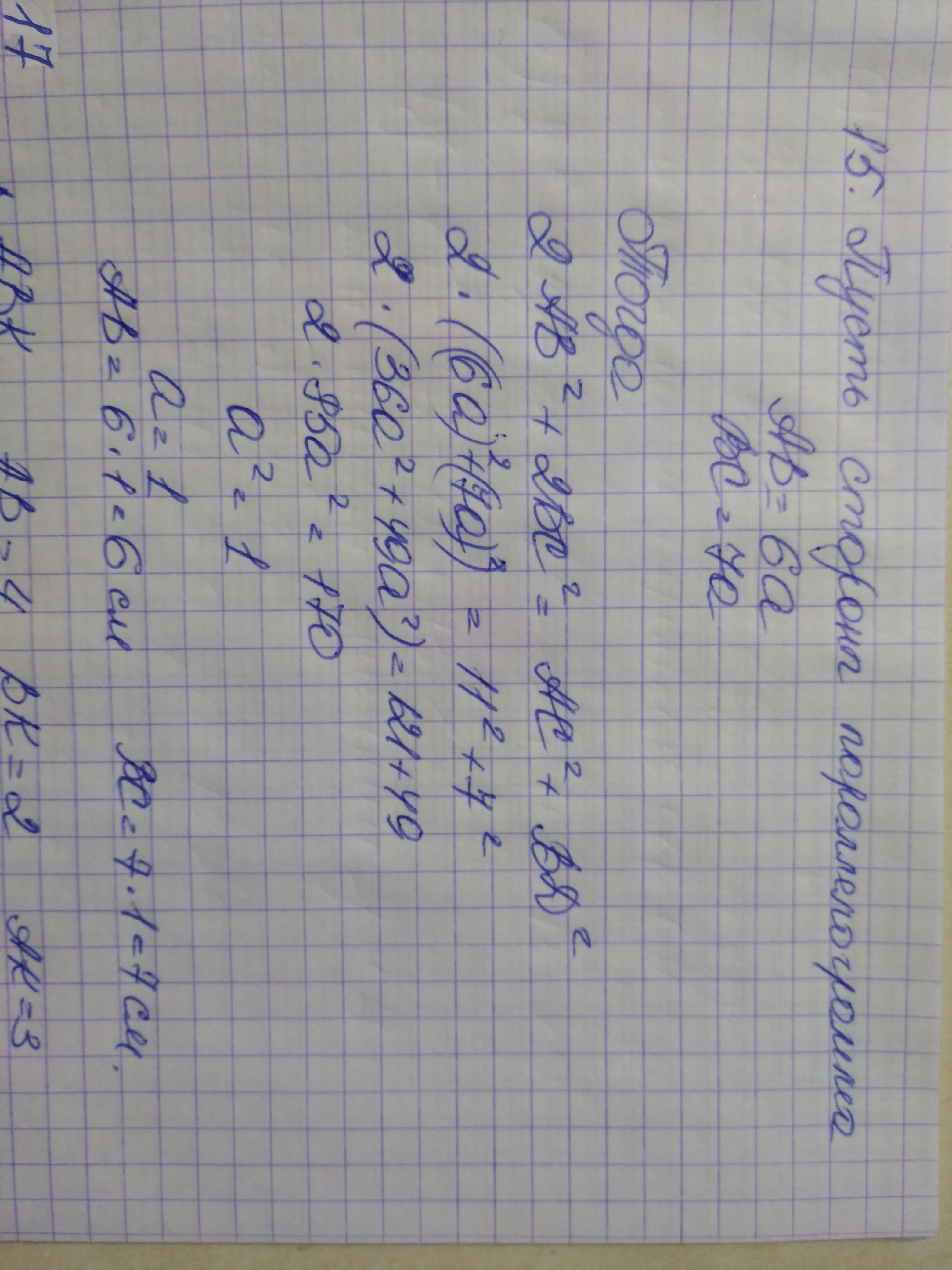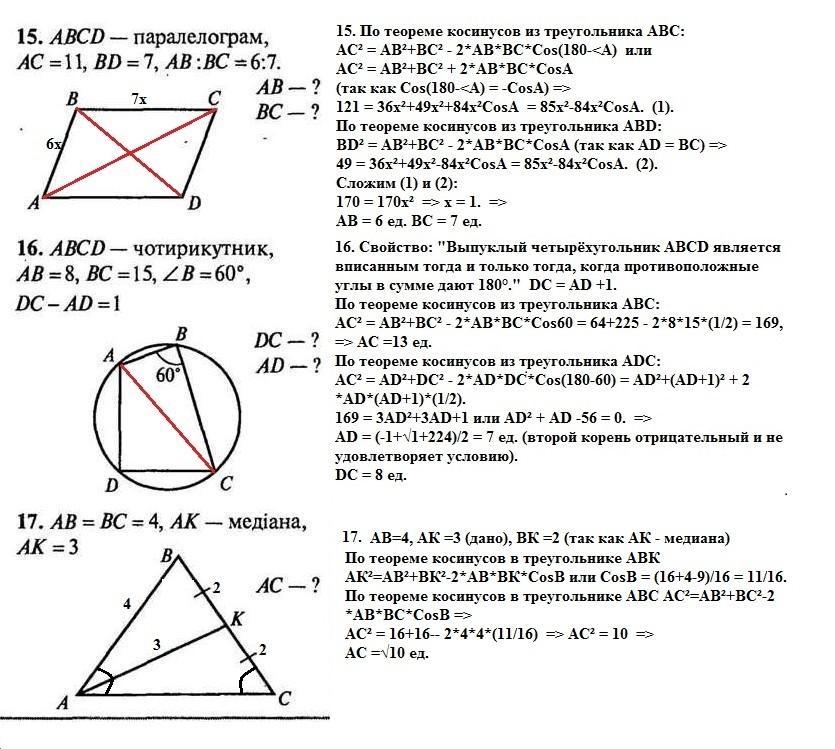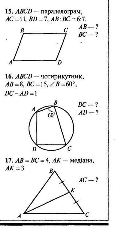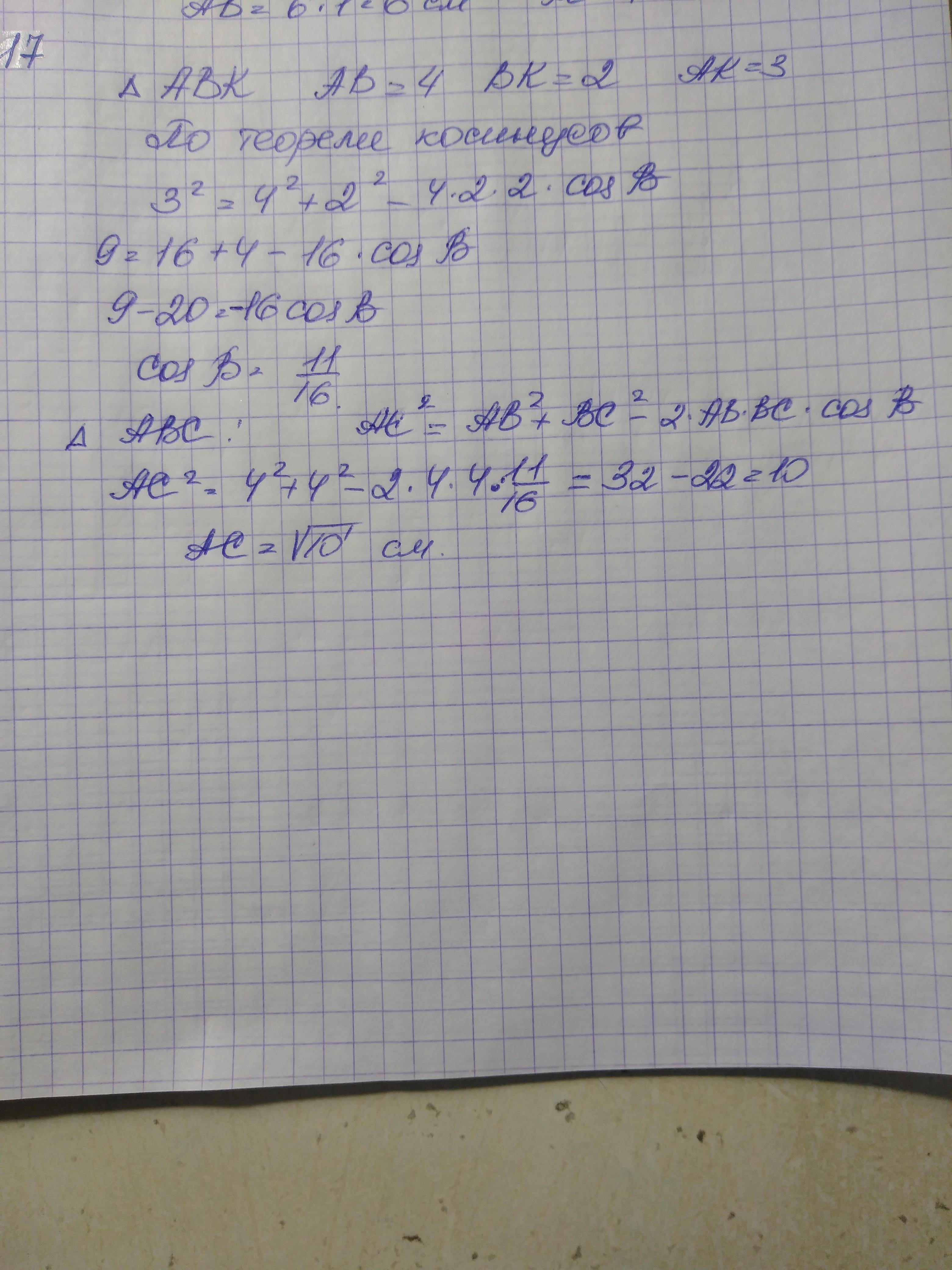 17. АВ=4, AК =3 (дано), ВК =2 (так как АК - медиана)
