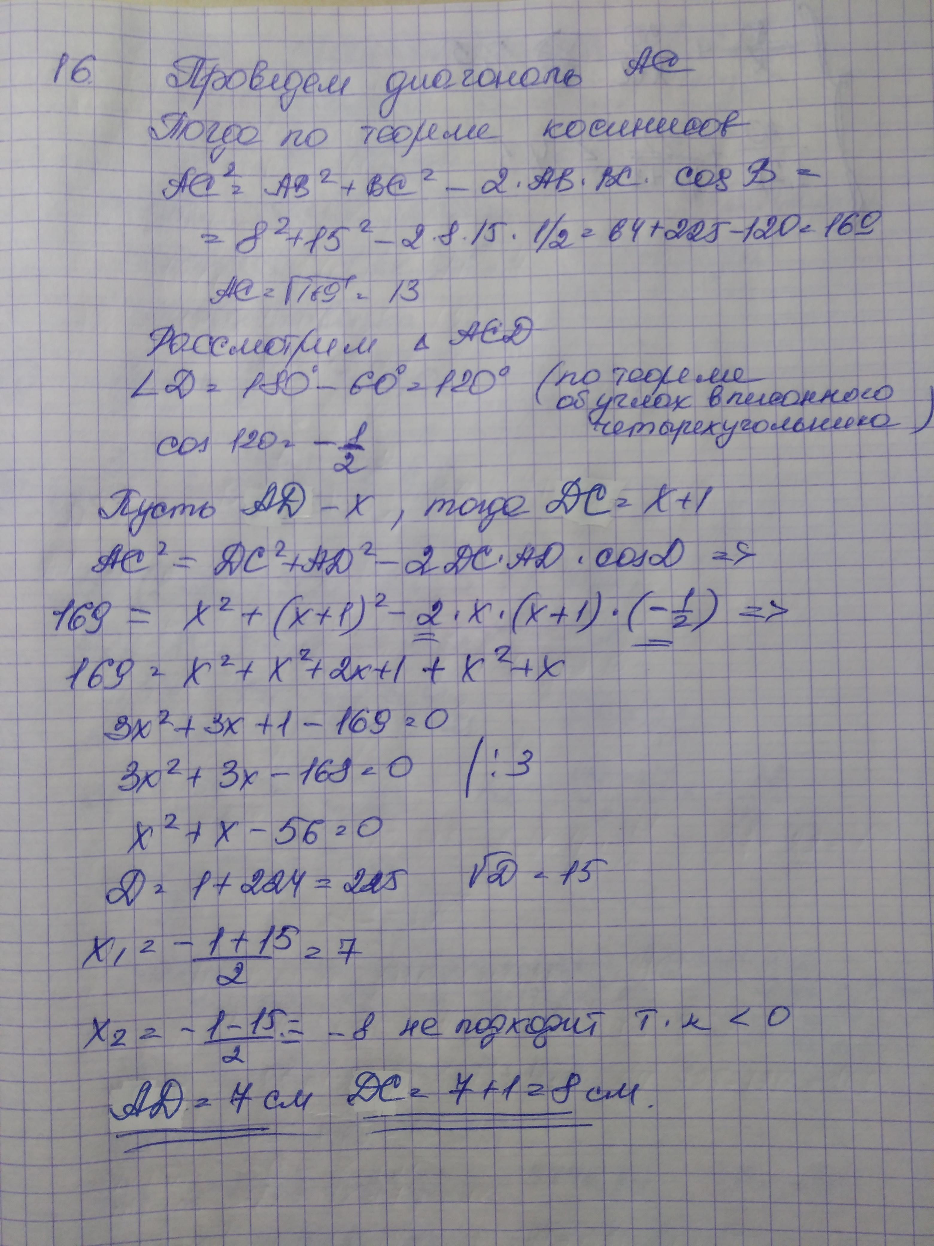 AD = (-1+√1+224)/2 = 7 ед. (второй корень отрицательный и не удовлетворяет условию).