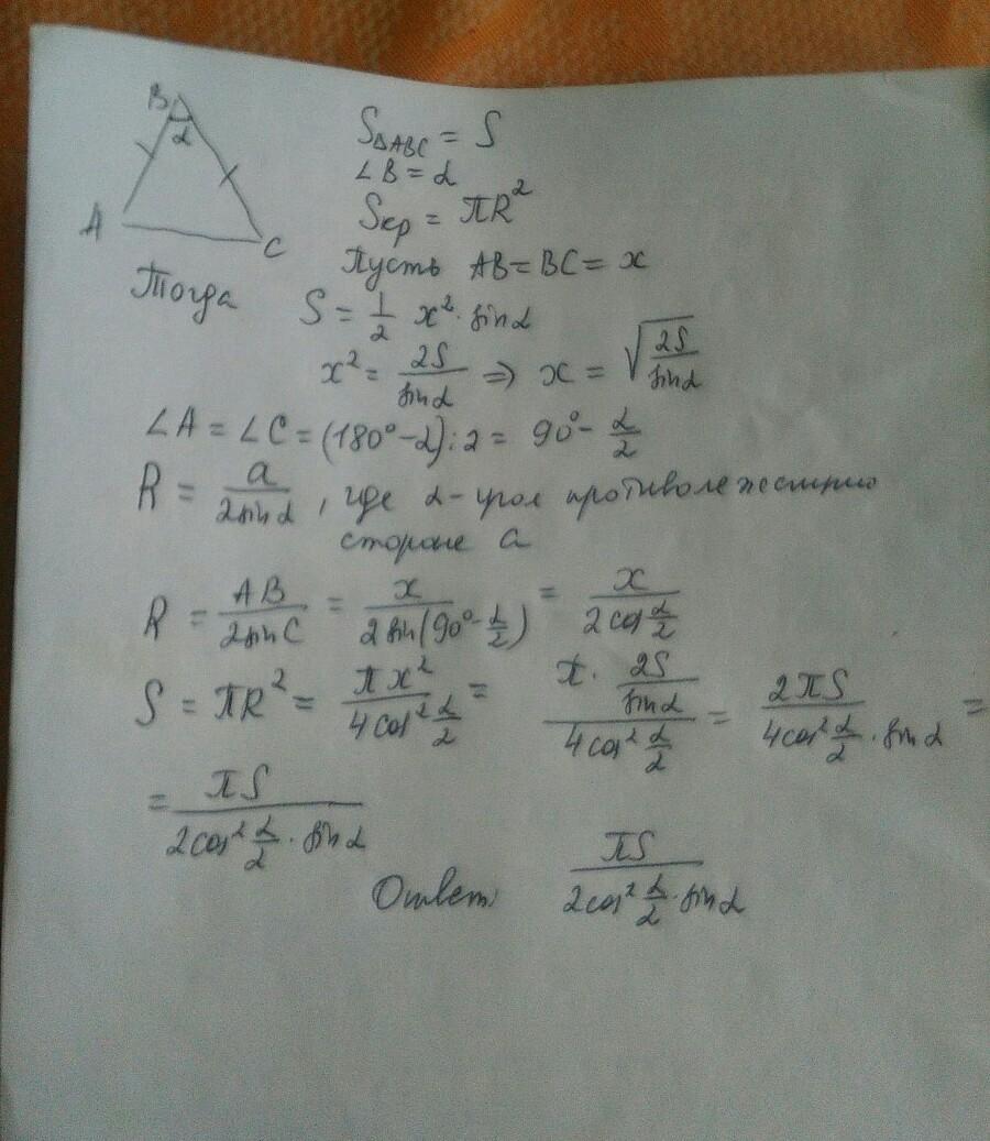 Площадь равнобедренного треугольника равна S, угол при вершине равен а. Найдите площадь круга, описанного возле данного треугольника.