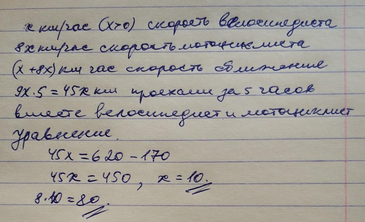 З двох міст, відстань між якими 620 км, виїхали назустріч один одному велосипедист і мотоцикліст. Через 5 год відстань між ними становила 170 км. Яка