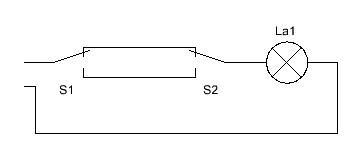 Для освітлення довгих коридорів (або сходів у під'їздах) можна з'єднати проводи так, щоб у кінцях коридору (або на нижньому і верхньому майданчиках сходів) було по одному вимикачеві. У який бік не йшла б людина, вона за допомогою першого вимикача може ввімкнути освітлення, а другим - погасити його. Складіть схему, яка задовольняла б такі умови. Постарайтеся при цьому використати якнайменше проводів.