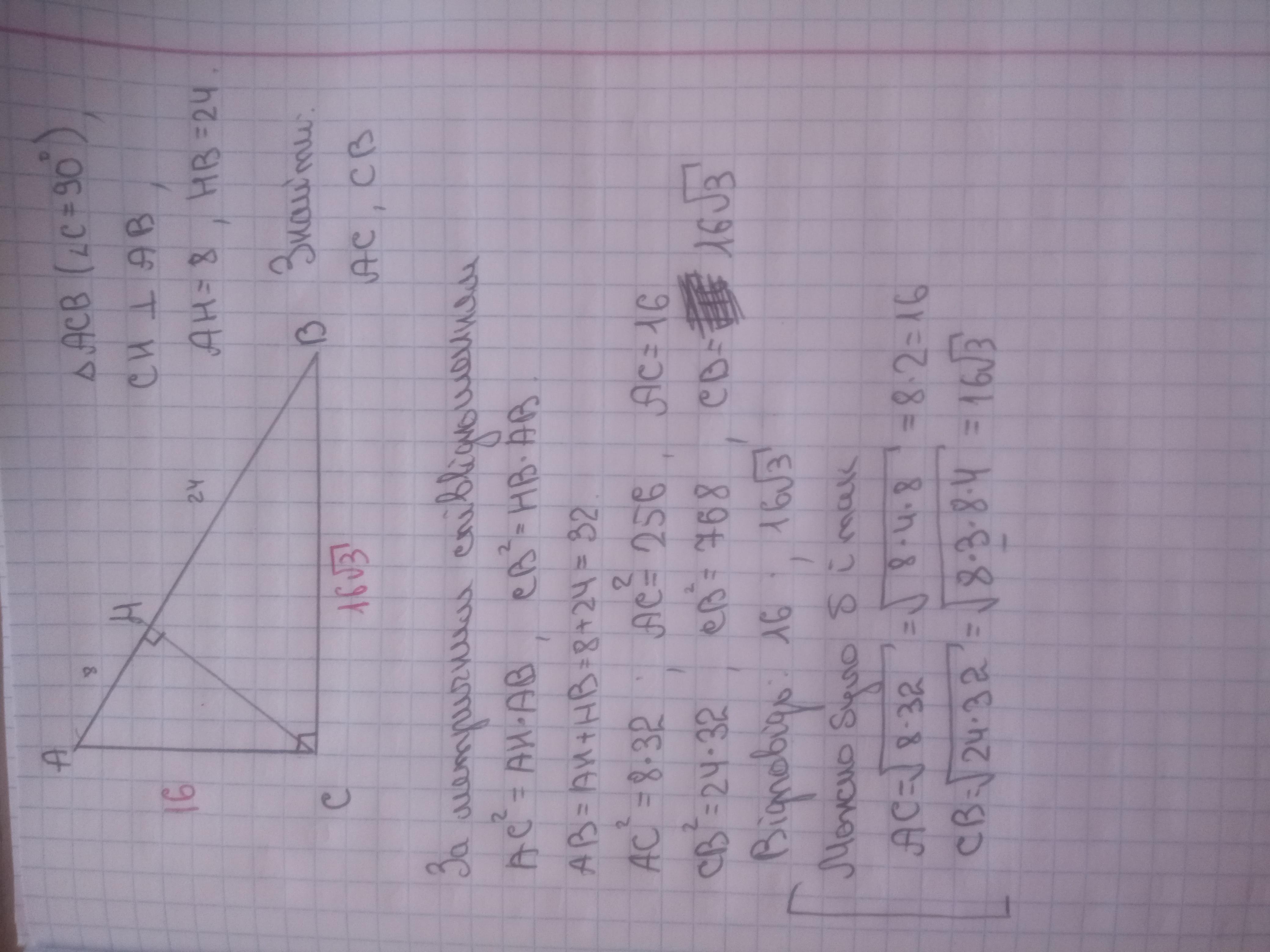 висота прямокутного трикутника проведена до гіпотенузи ділить її відрізки завдовжки 8 і 24