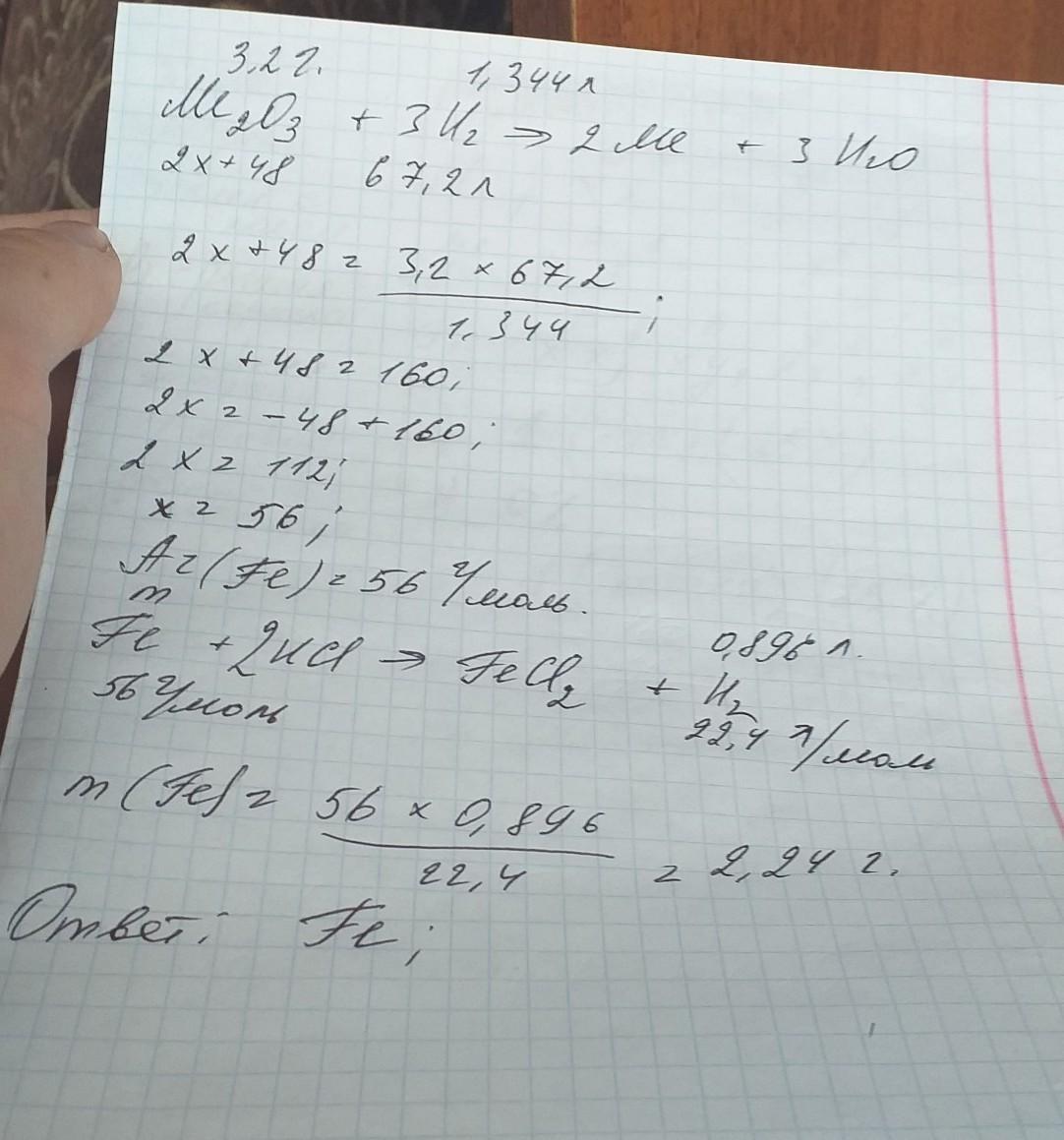 На восстановление оксида неизвестного металла(lll) массой 3,2г потребовался водород объемом 1,344 дм^3(н.у.). Металл потом растворили в избытке раствора соляной кислоты, при этом выделился водород объемом 0,896 дм^3. Определите металл и напишите уравнения соответствующих реакций.