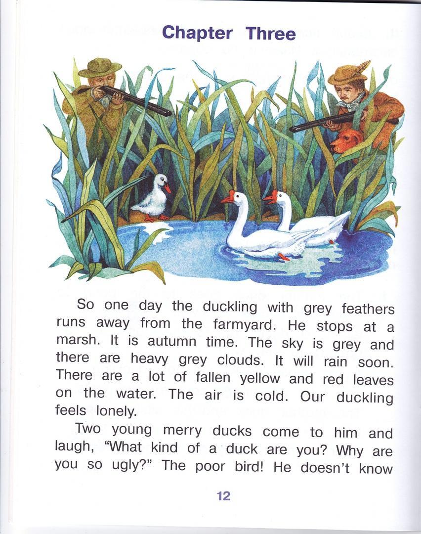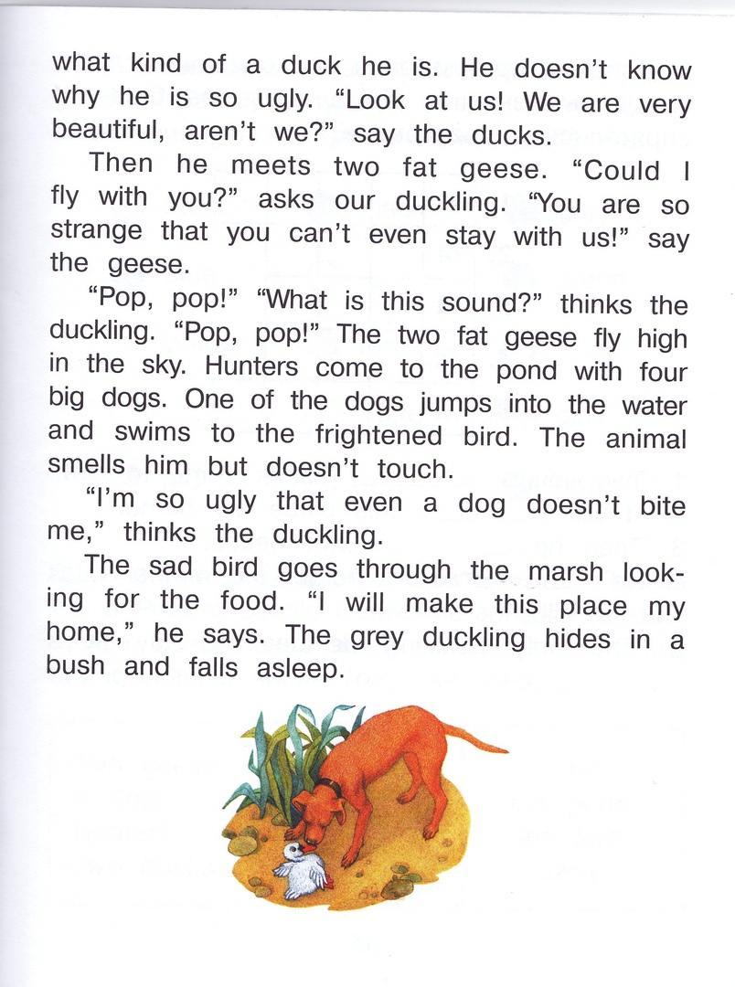 The duckling left the farmyard and came to the marsh. Young ducks and two fat geese thought the ducking was very ugly and nobody wanted to stay with him.Then to the pond came hunters with four dogs.One dog smelled the duckling and didn’t touch it because of it’s ugliness ,the duckling thought.The ugly duckling decided to make the marsh his home