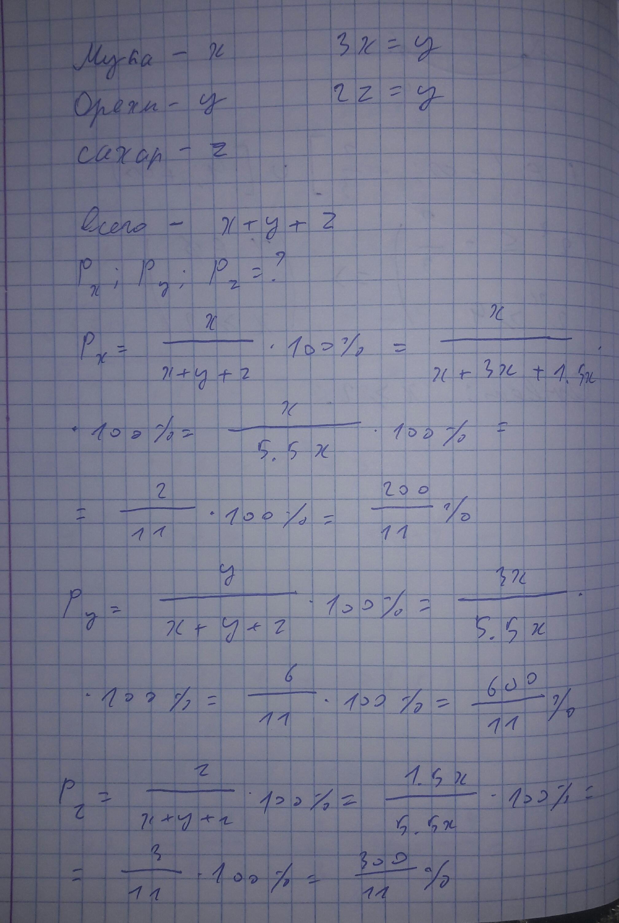 Ответ: 200/11% муки, 600/11% орехов, 300/11% сахара.