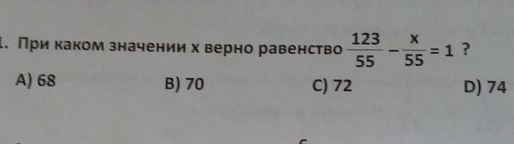 нужно, чтобы дробь в ответе была 55/55, что и равно 1. Знаменатели одинаковые, ищем числиель 123-55=68. Ответ А