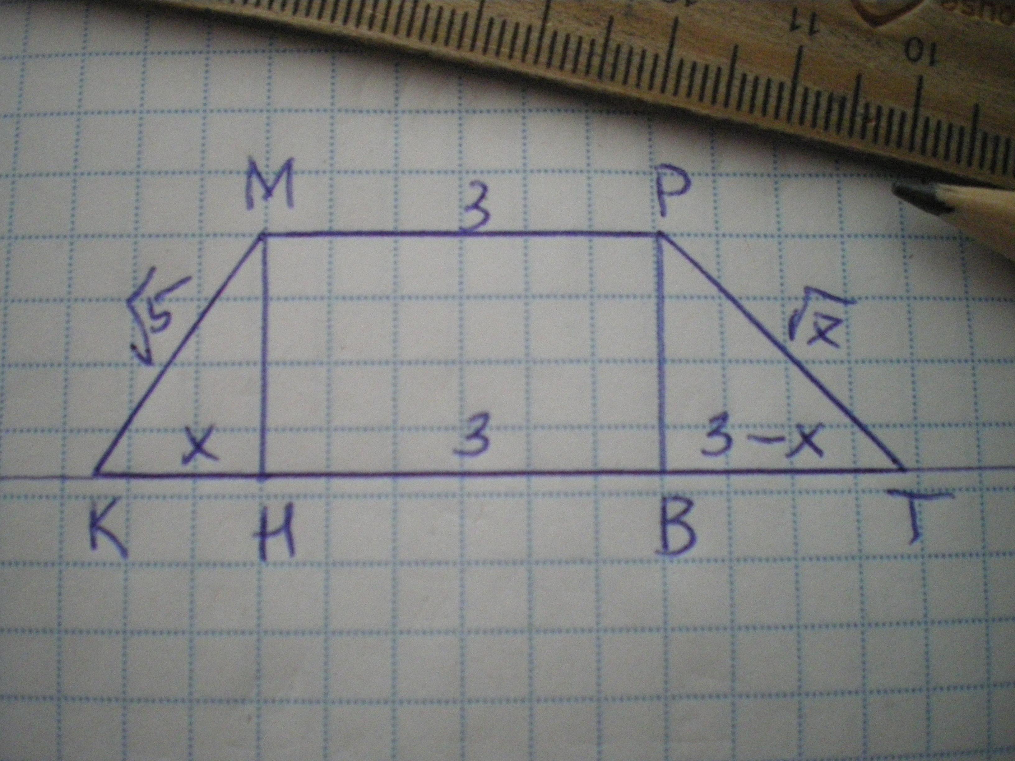 Дано: КМРТ - трапеция, КМ=√5, РТ=√7, МР=3, КТ=6. МН - высота.
