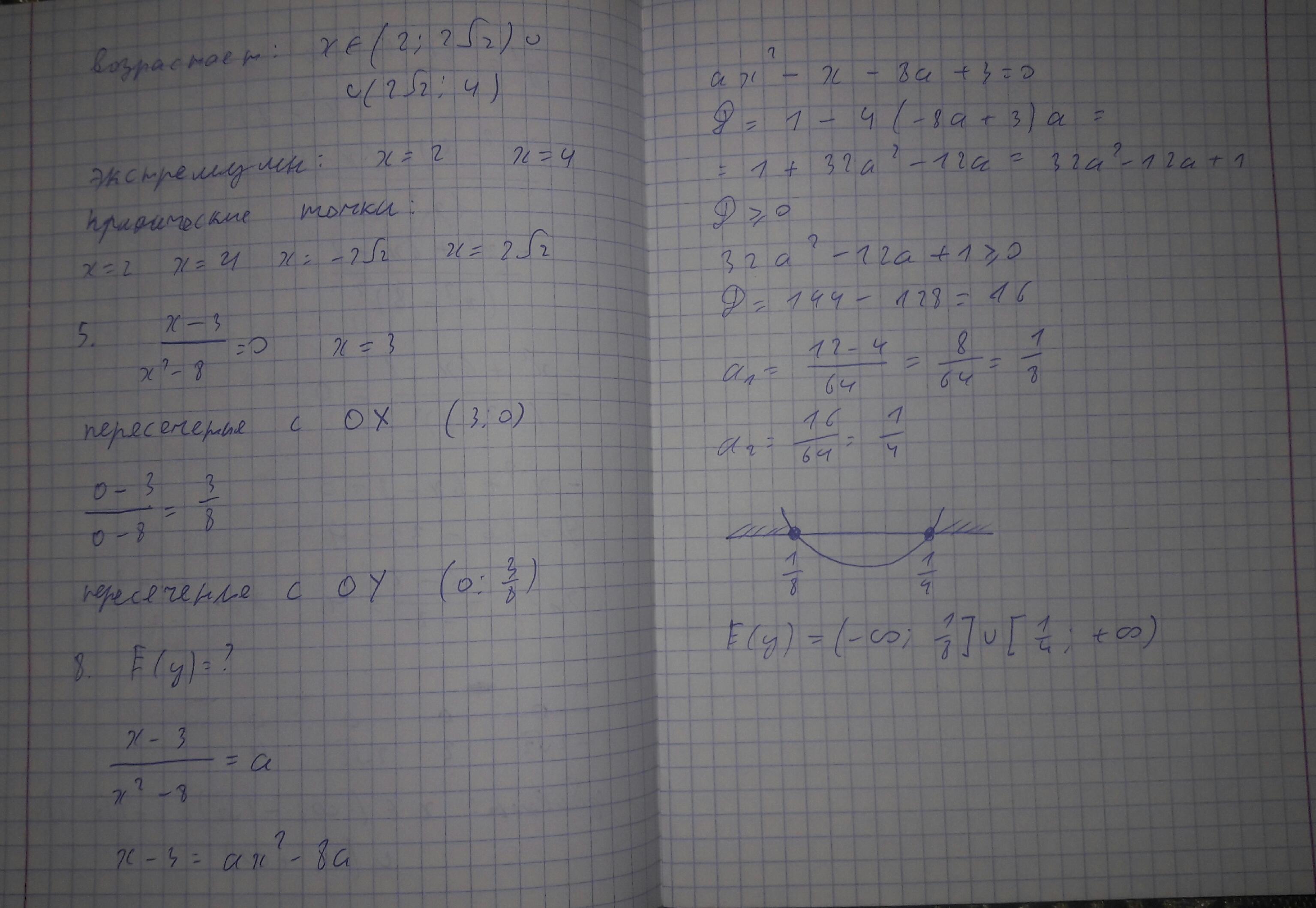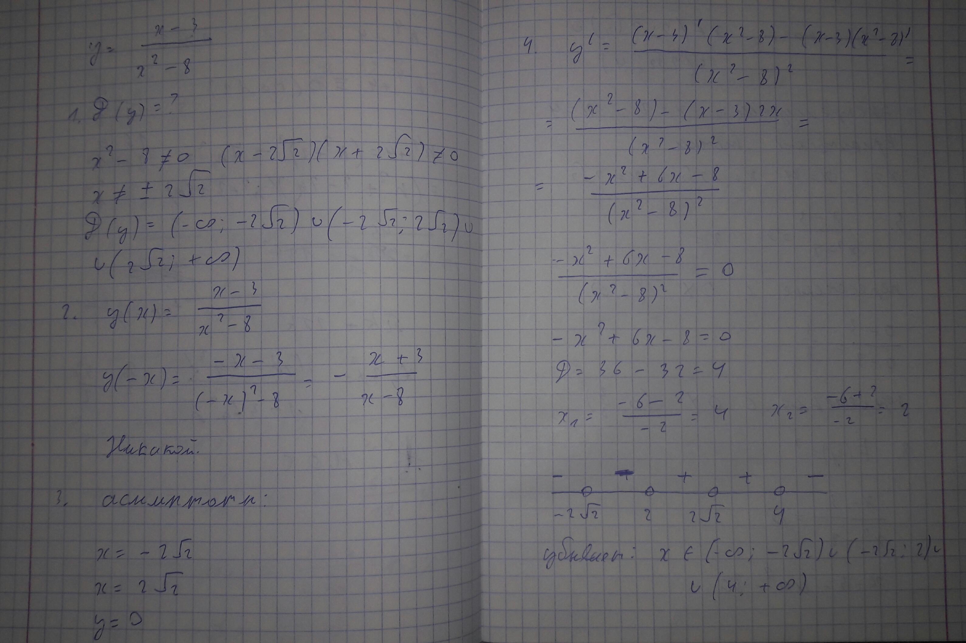 Примечание: я не стал писать 6 пункт, раньше ничего такого не встречал, но думаю для построения графика достатачно знать асимптоты и любое значение при x<-2sqrt2 и x>4.