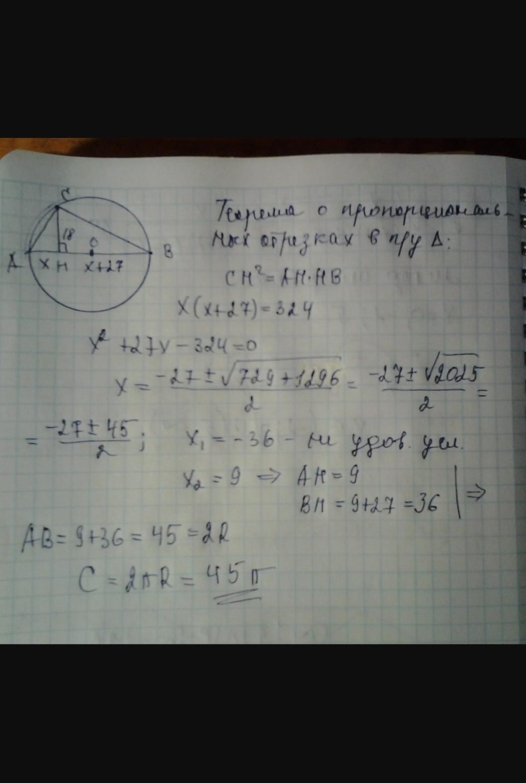 Теорема о пропорциональных отрезках в прямоугольном треугольнике: угол АСВ=90 градусов, как вписанный, опирающийся на диаметр. И применена формула длины окружности