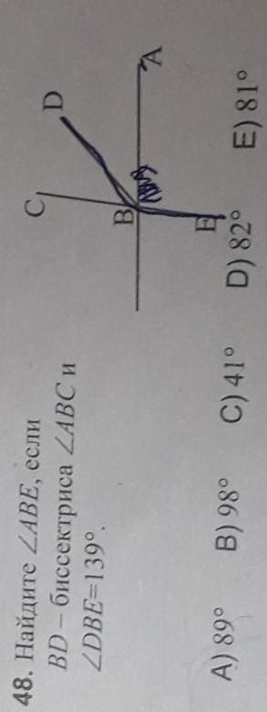 Угол DBE смежный с углом CBD. С этого имеем: 180-139=41. Мы нашли угол CBD, помним что он равен и углу DBA, так как BD- бисектриса. CBD=DBA=41°. Угол CBA=41°+41°=82°