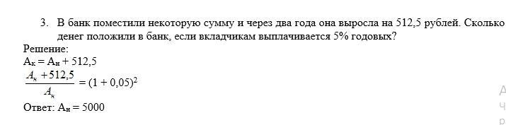 В банк поместили некоторую сумму и через два года она выросла на 512,5 рублей. Сколько денег положили в банк, если вкладчикам выплачивается 5% годовых.