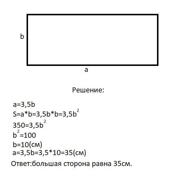 Найдите большую сторону прямоугольника, площадь которого равна 350см², а одна из сторон в 3,5 раза больше другой