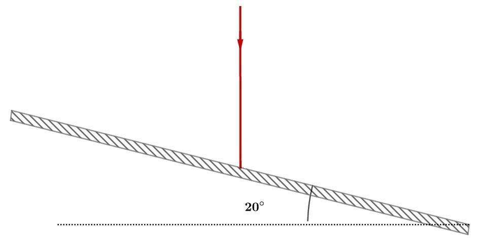 Вертикальный луч падает на зеркало, расположенное под углом 20 градусов к горизонту (см. рисунок). Под каким углом к горизонту будет распространяться луч, отражённый от зеркала? Ответ выразить в градусах, округлив до целых.