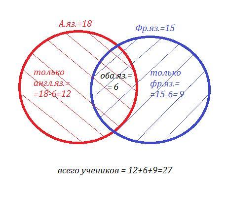 Если сложить число учеников, изучающих англ. яз., и число учеников, изучающих фр. яз., то получим 18+15=33 ученика. Это больше, чем число всех учеников в классе, 33>27 . Значит есть ученики, которые одновременно изучают оба языка. И их будет 33-27=6 .